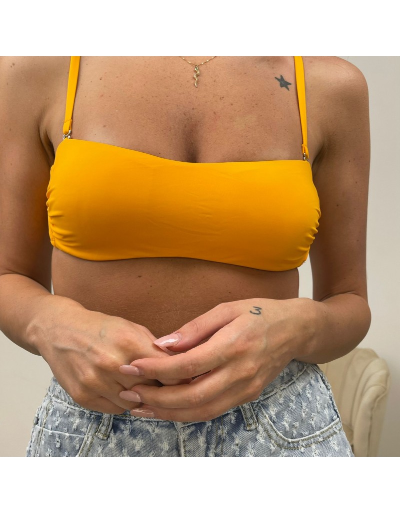 Costume a fascia monocolore con coppette e bretelle sottili,chiusura nella parte posteriore con laccetti.