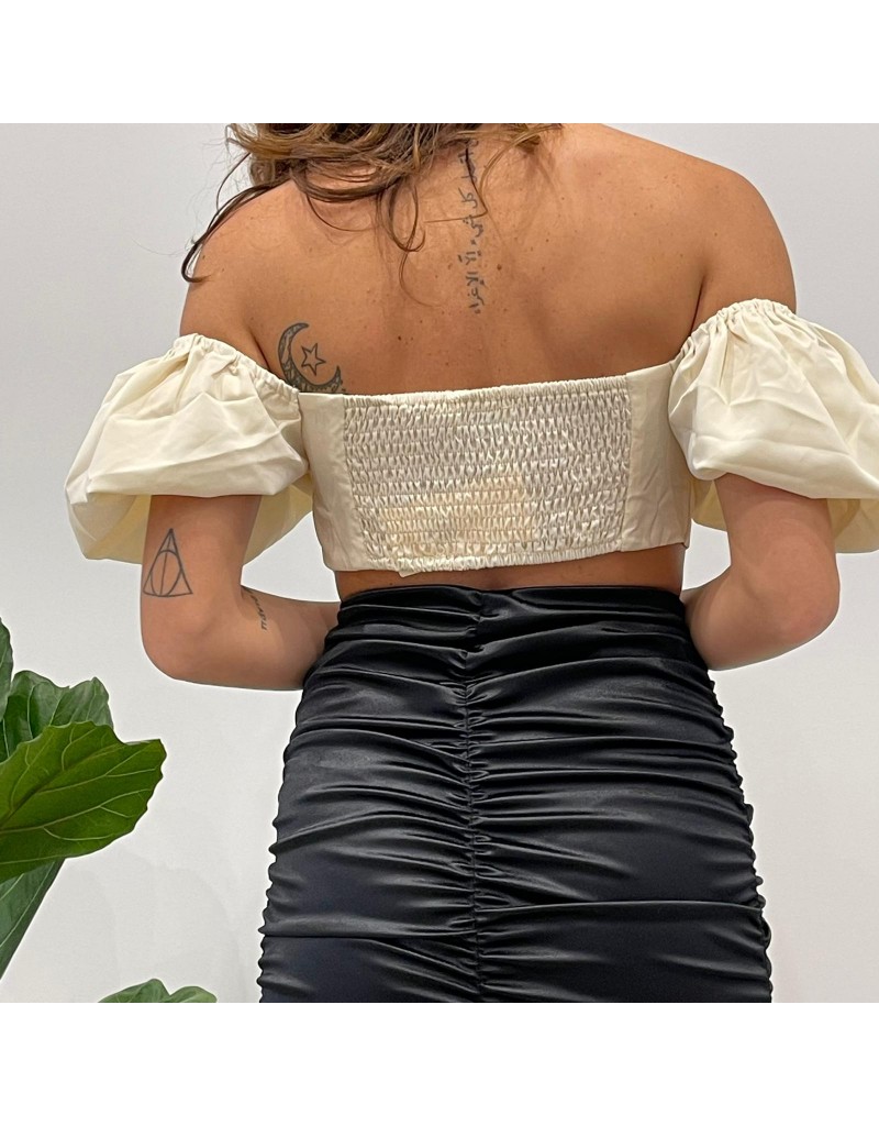 Top corto in cotone scollo a barca con manica a sbuffo,chiusura con laccetti sul davanti e nastro elasticizzato nella parte posteriore.