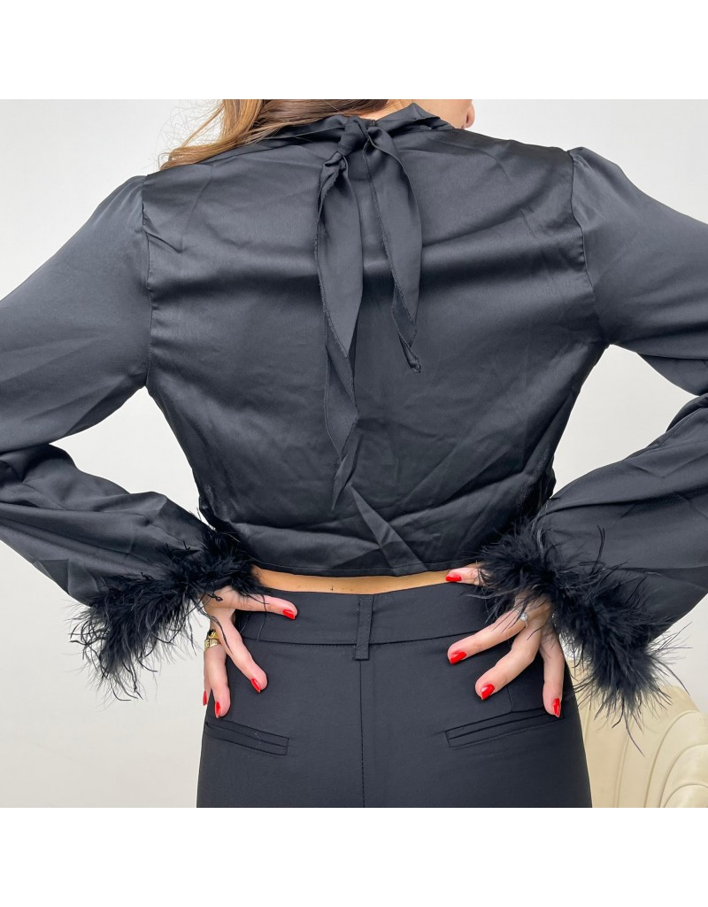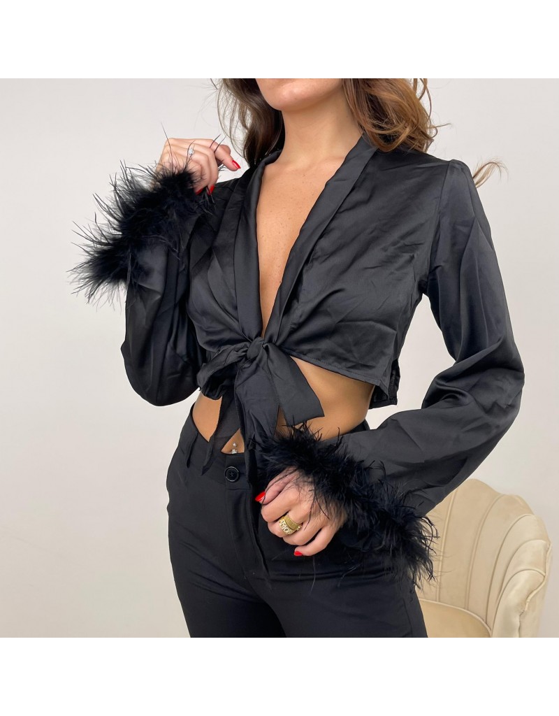 Blusa crop con chiusura a nodo, manica lunga con peluche sull'orlo.