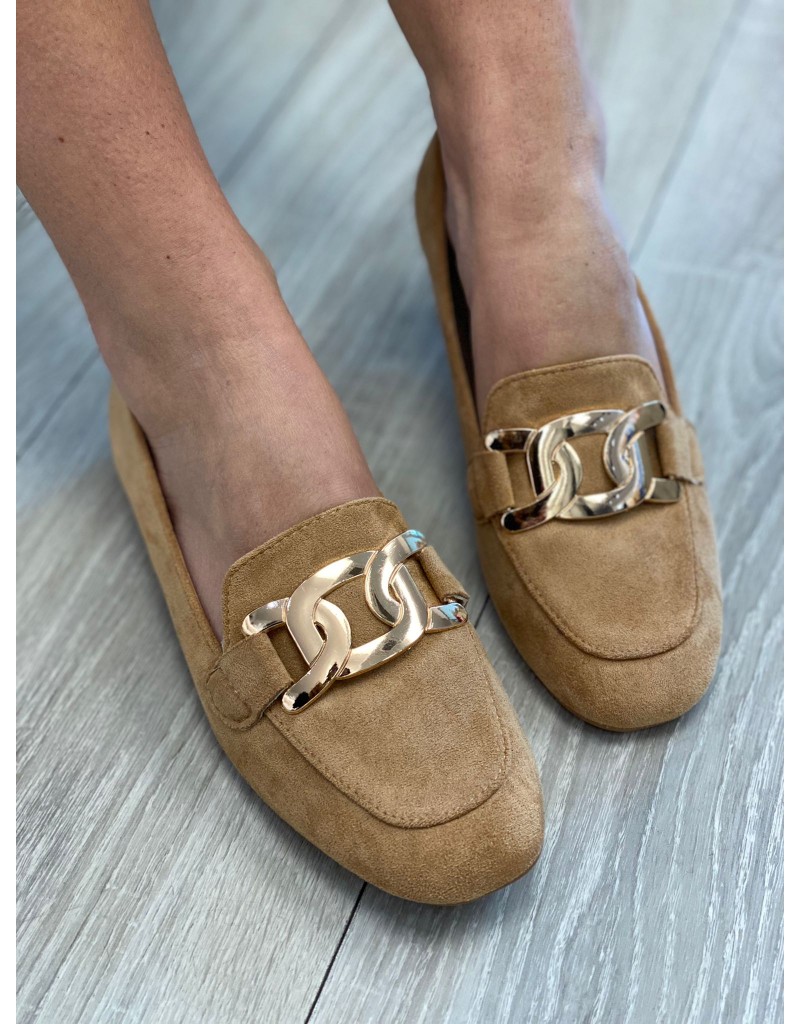 Mocassino basso con punta leggermente arrotondata,effetto scamosciato.Dettaglo di catena oro applicata sul collo piede.