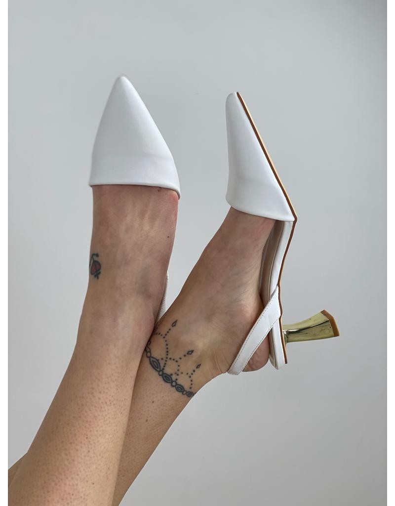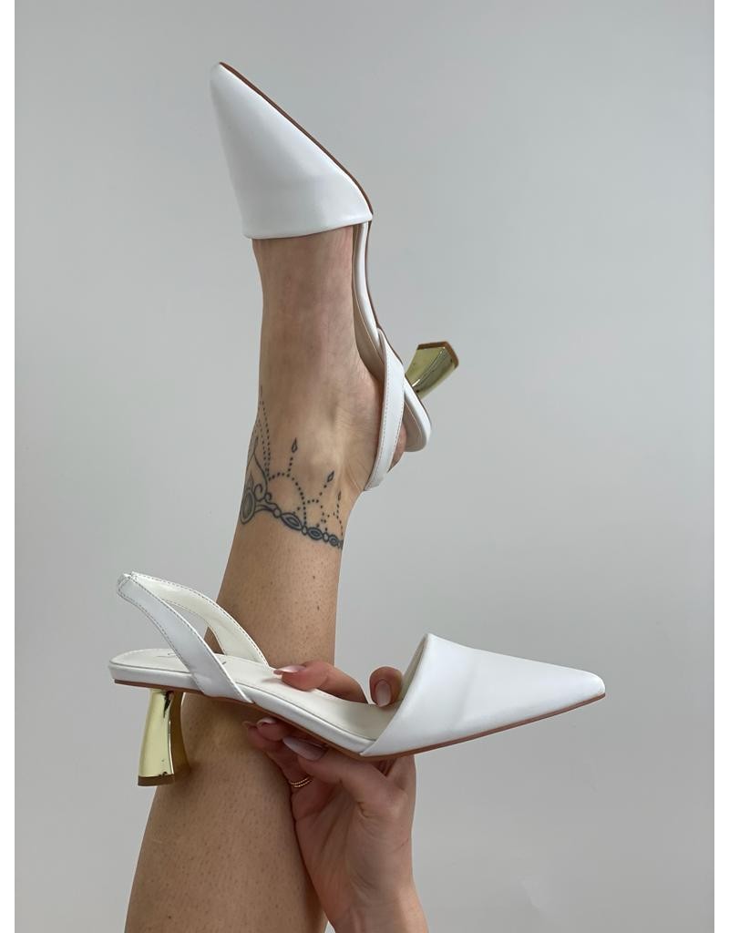 Dèccolletè a punta in eco-pelle, con tacco gold sottile comodo e nastro elasticizzato sulla caviglia