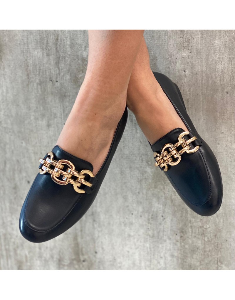 Mocassino basso con punta arrotondata in ecopelle.Dettaglio di catena oro applicata sul collo piede.