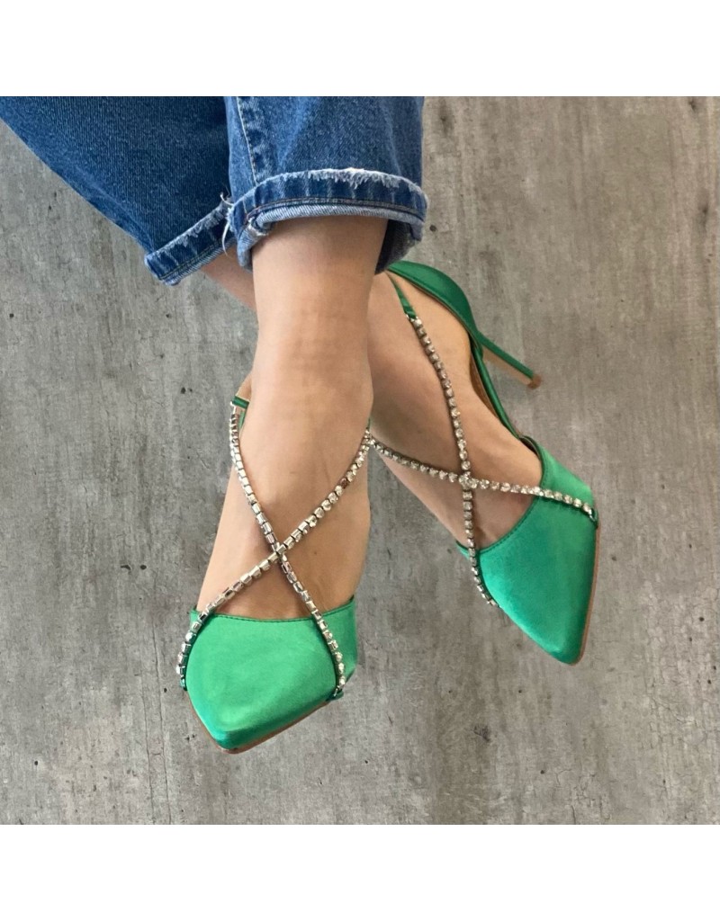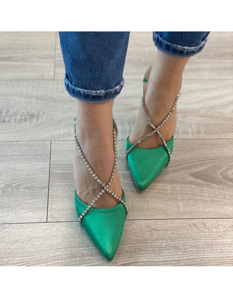 Dècollete effetto raso a punta,con fascette sottili sul collo piede con strass.Tacco sottine 10cm