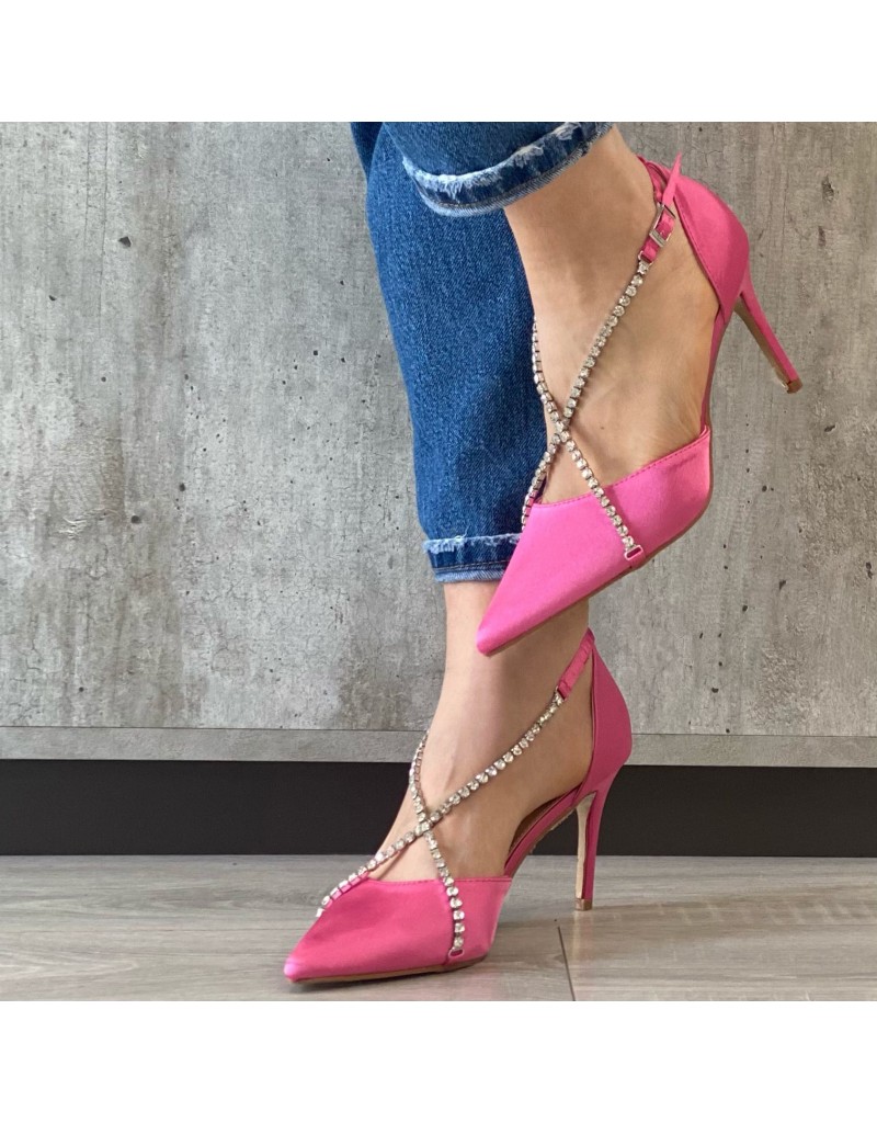 Dècollete effetto raso a punta,con fascette sottili sul collo piede con strass.Tacco sottine 10cm