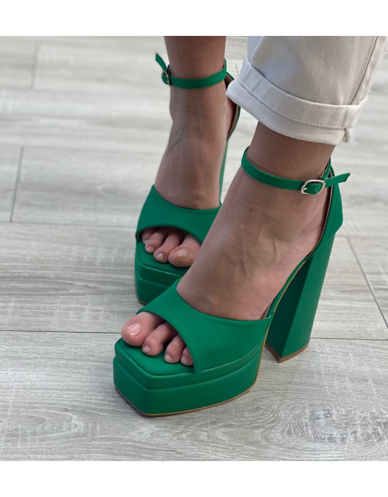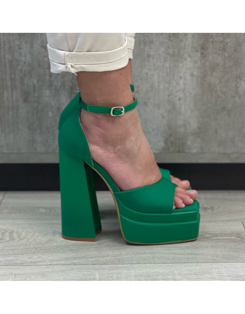 Sandalo con tacco largo alto e plateau in tessuto,chiusura con cinturino e fibbia alla caviglia.