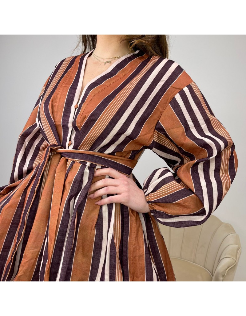 Dress con fantasia a righe,cintura in vita e manica lunga.