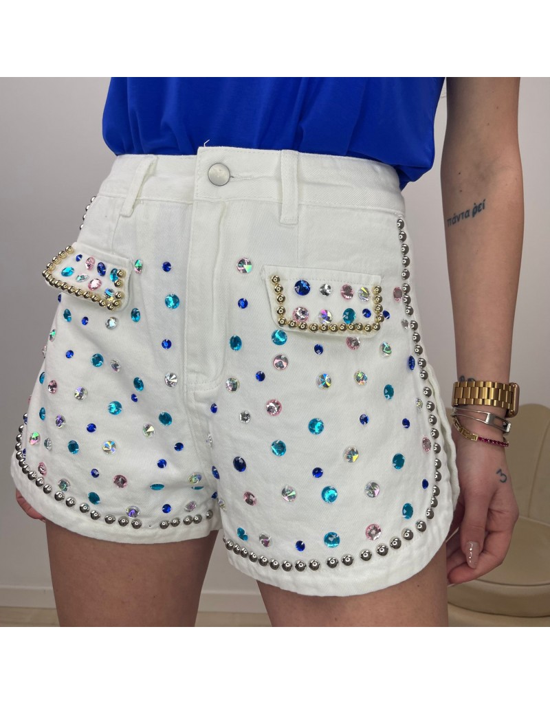 Short ginsato a vita alta ricoperto di strass colorati.Chiusura frontale con bottone