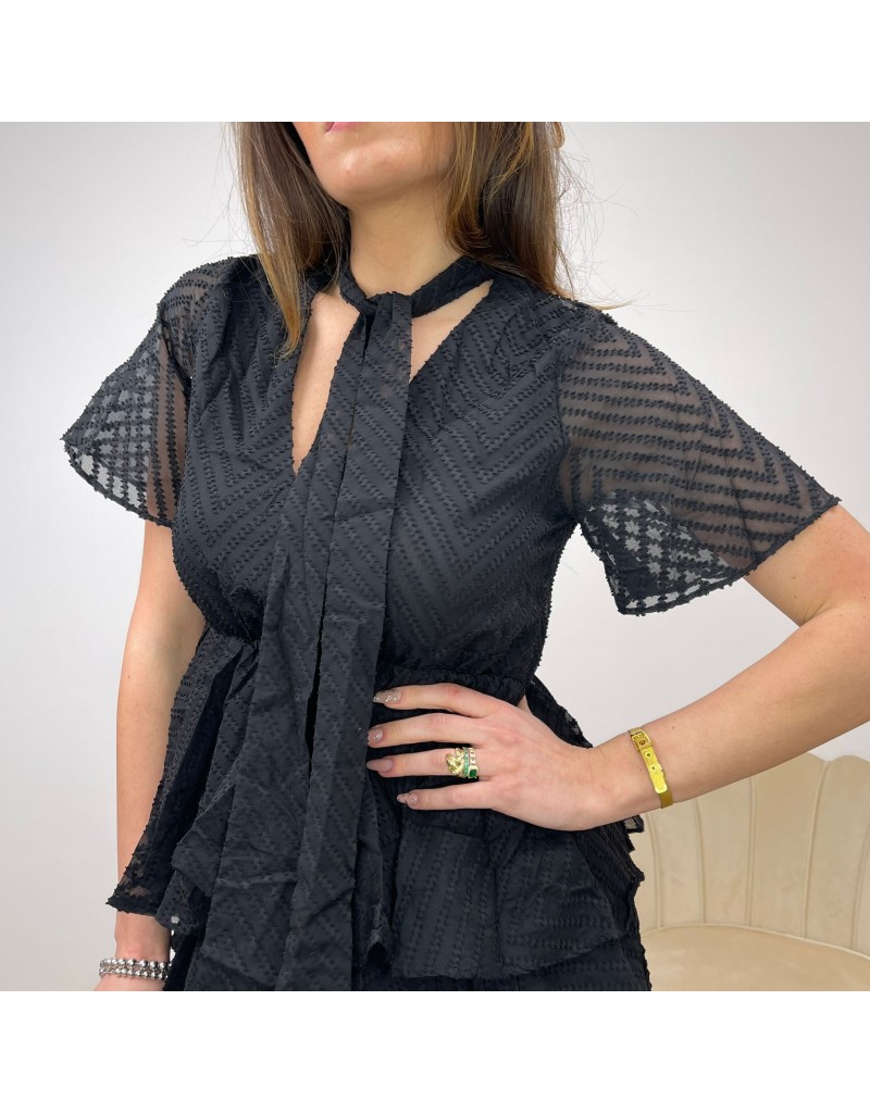 Dress con cravatta e balze in tessuto velato.