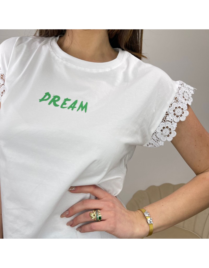T-Shirt con profili in macramè sulle maniche e stampa "dream".