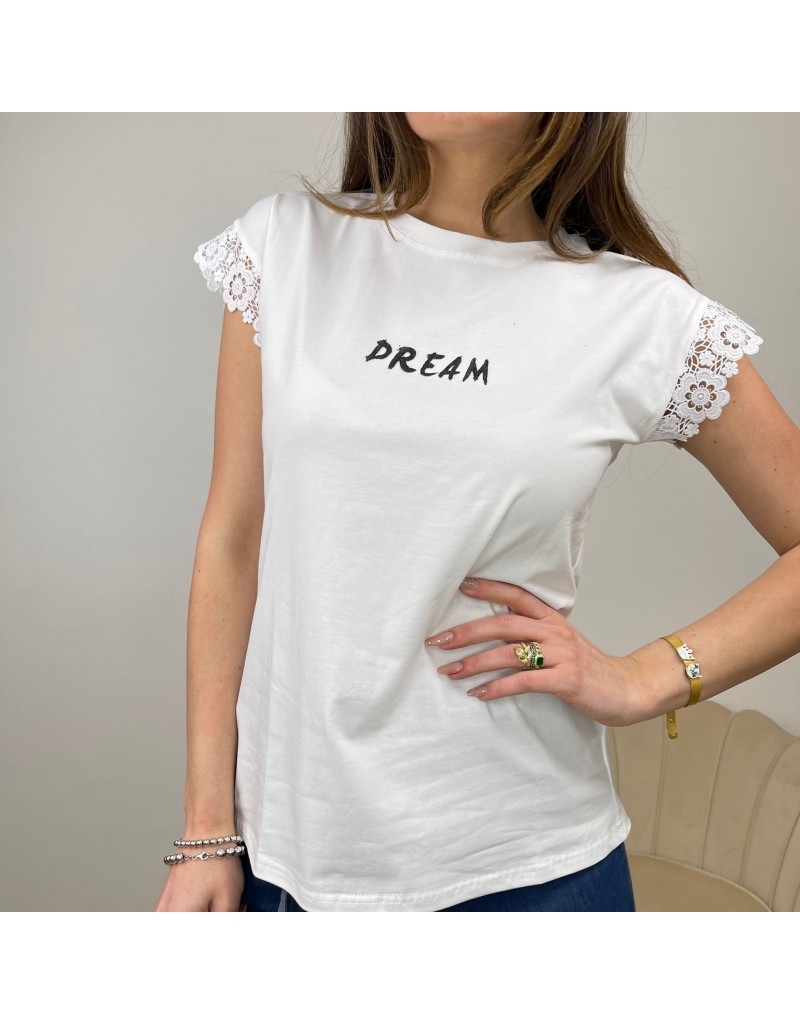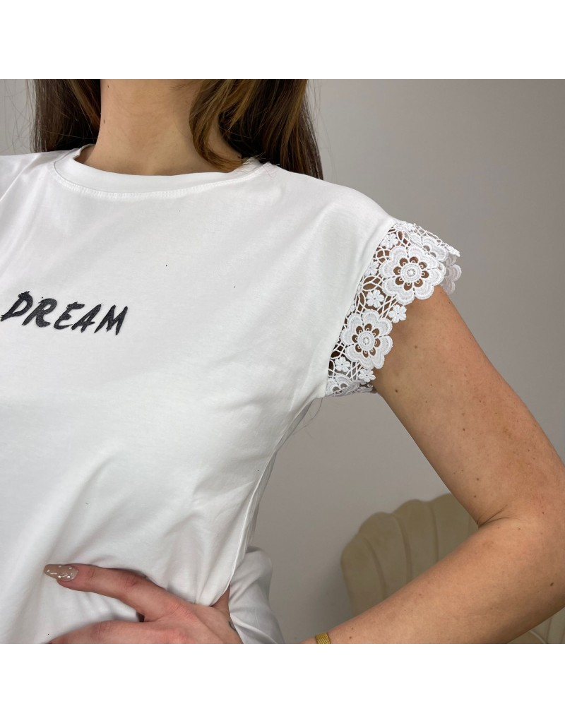 T-Shirt con profili in macramè sulle maniche e stampa "dream".