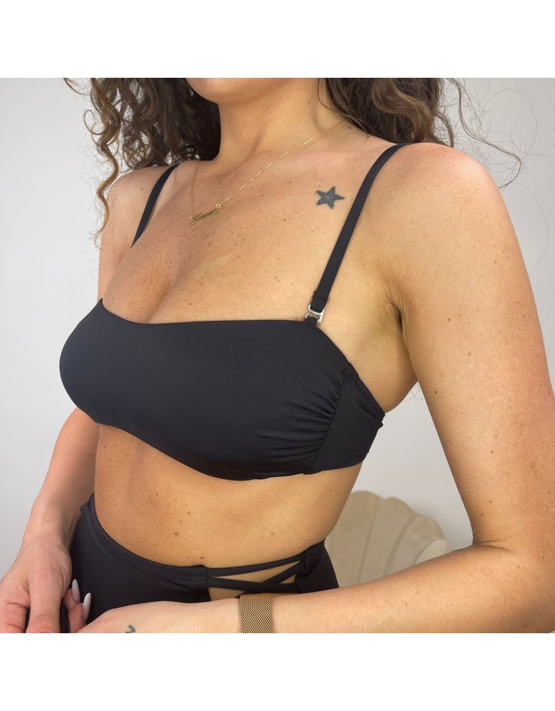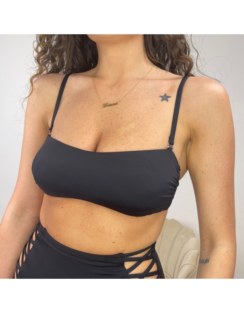 Costume a fascia monocolore con coppette e bretelle sottili,chiusura nella parte posteriore con laccetti.