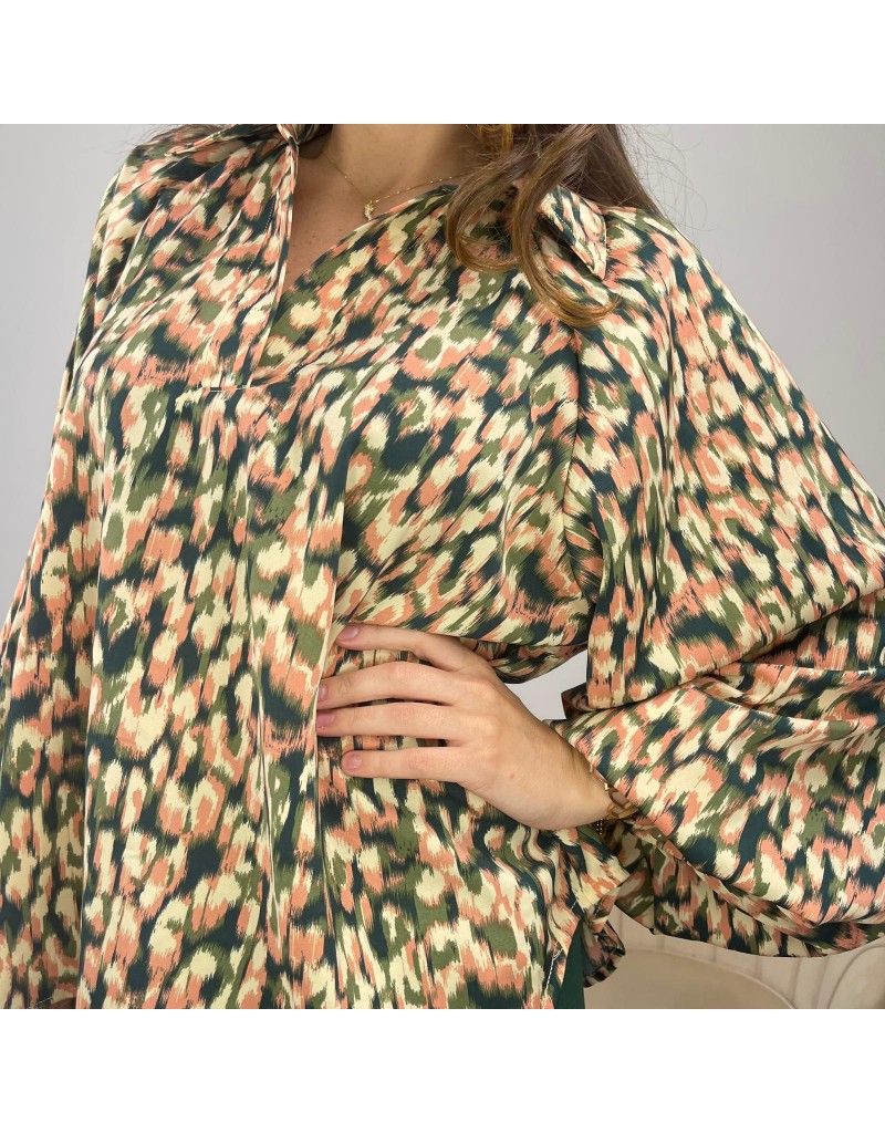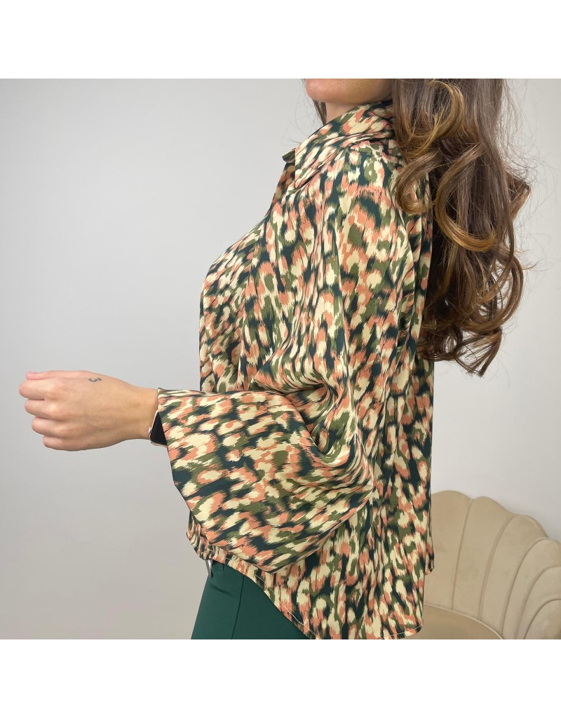Blusa fantasia multicolor, a maniche lunghe ampie, con colletto a camicia.