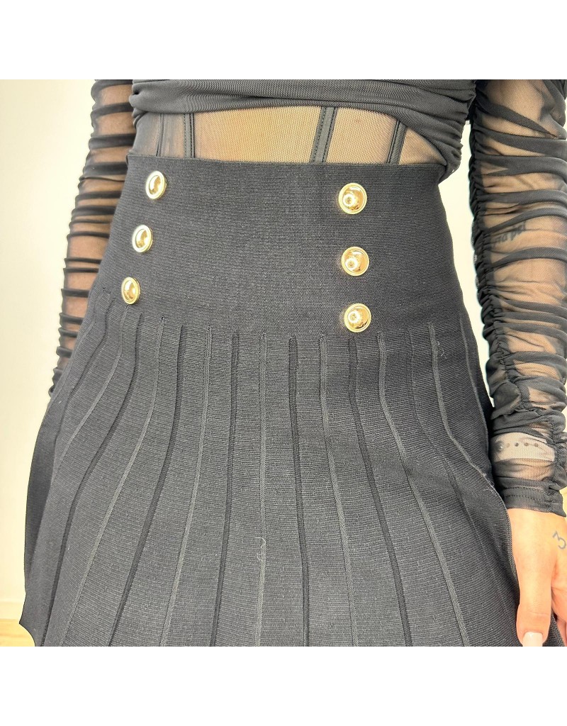 Minigonna plissettata in maglia, a vita alta con patte laterali e bottoni color oro.