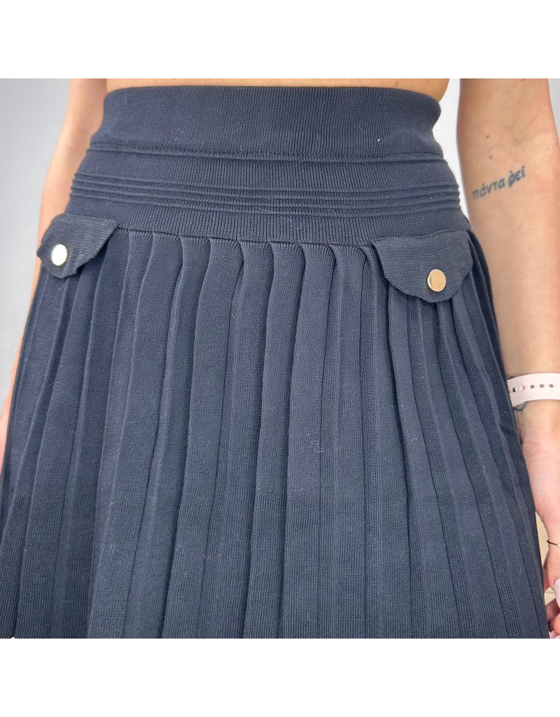 Minigonna plissettata in maglia, a vita alta con patte laterali e bottoni color oro.