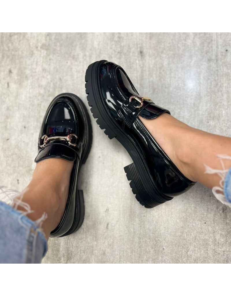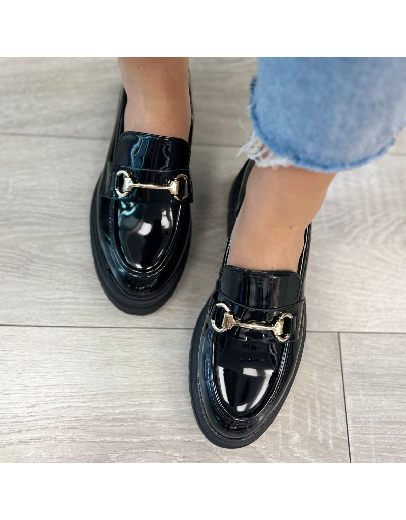 Mocassino in ecopelle lucido con punta arrotondata, fibbia in metallo color oro.Tacco 5 cm con spessa suola antiscivolo