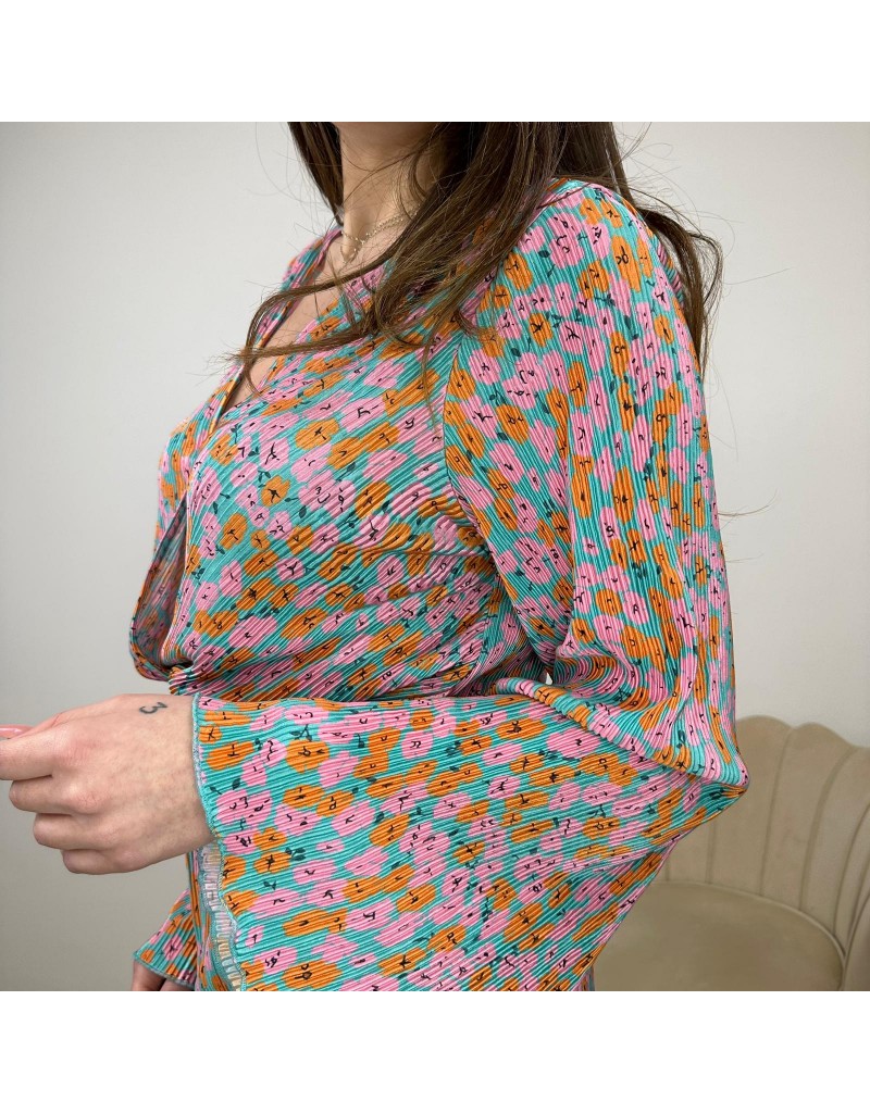 Tuta corta , in tessuto plissettato, con maniche ampie, ed elastico in vita.