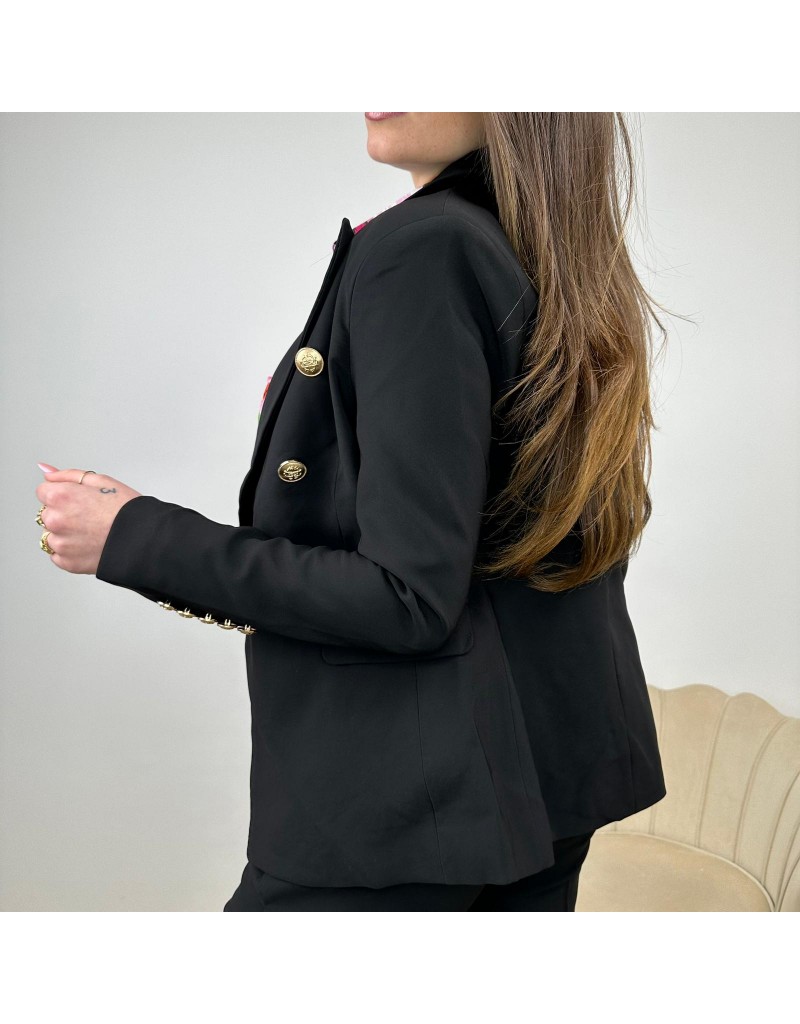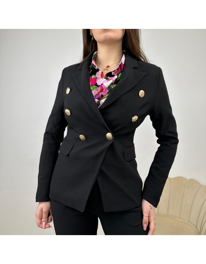Blazer doppiopetto, con collo rever a lancia, bottoni groffati color oro.