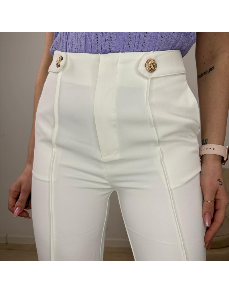 Pantaloni a zampa, vita alta con bottoni groffrati color oro.