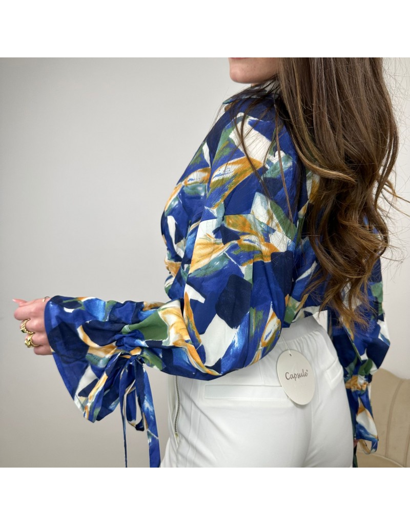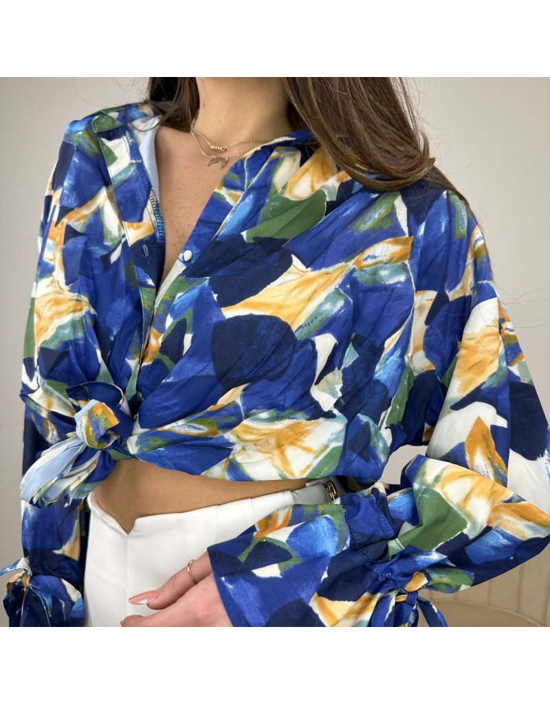 Camicia fantasia astratta ,con manica lunga morbida con laccetto , e chiusura frontale con bottoncini