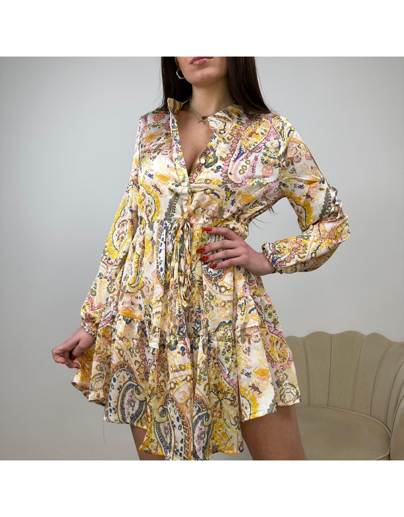 Dress fantasia paisley, in raso, con colletto coreano bottoncini e fiocchetto in vita.