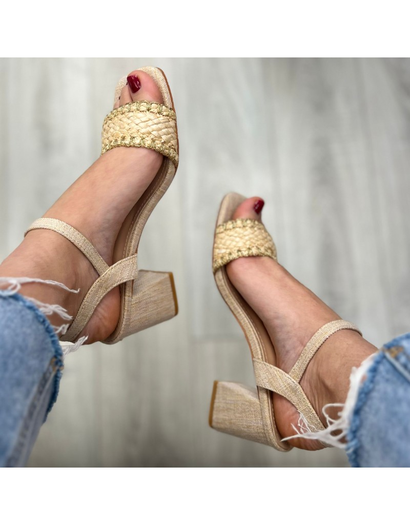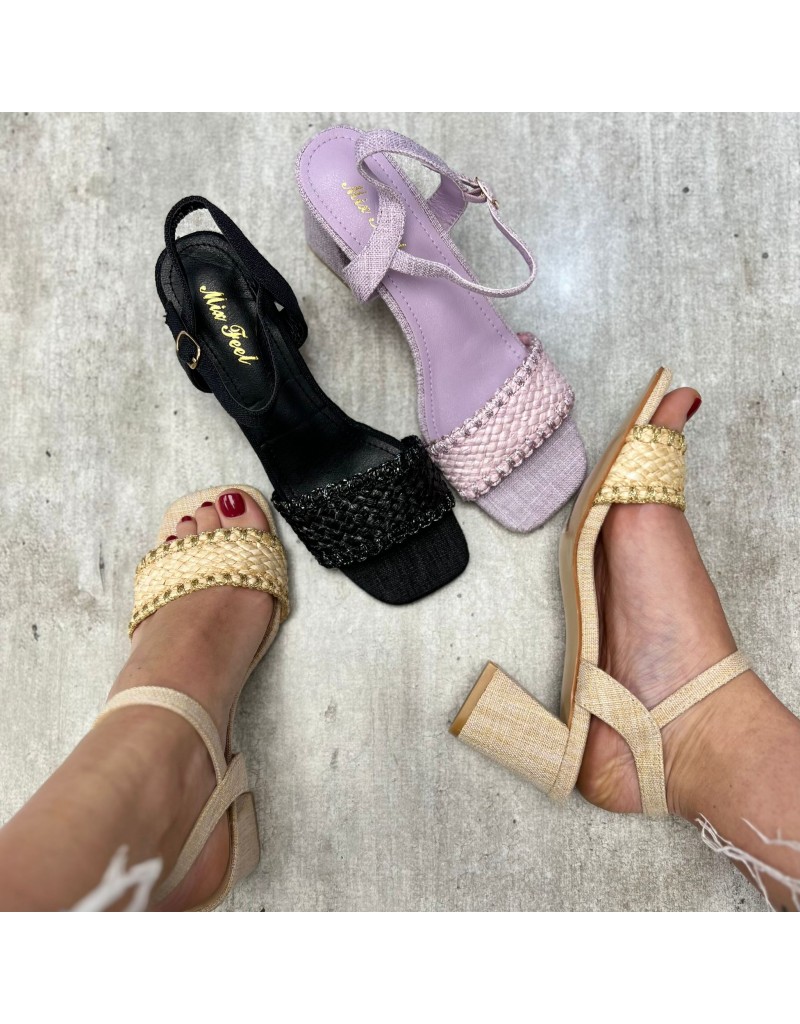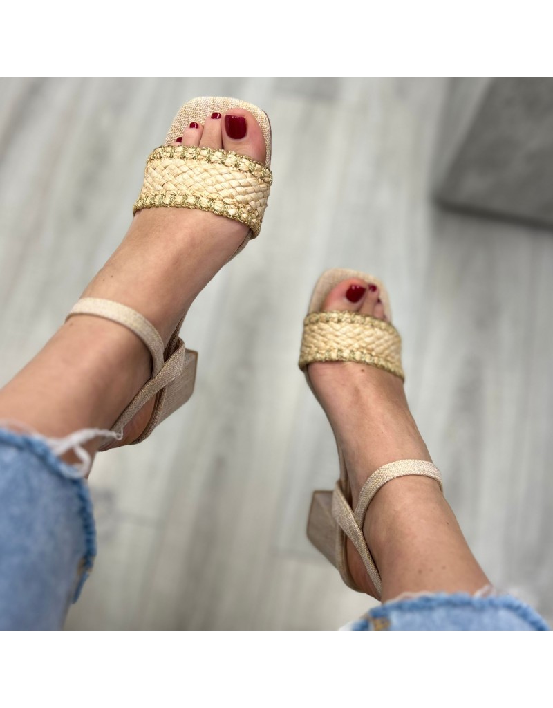 Sandali in tela, con fascia intrecciata e cinturino regolabile alla caviglia.