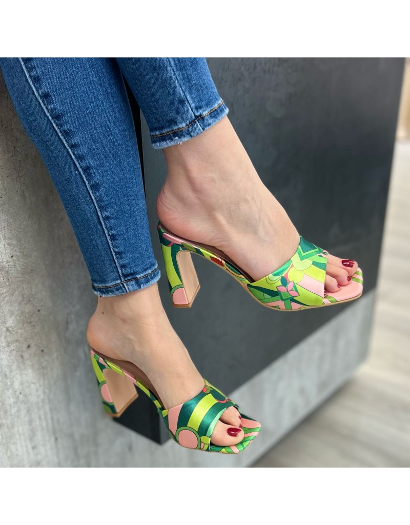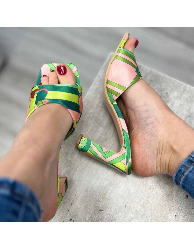 Sandali in raso, con punta squadrata, fantasia astratta, senza cinturino.