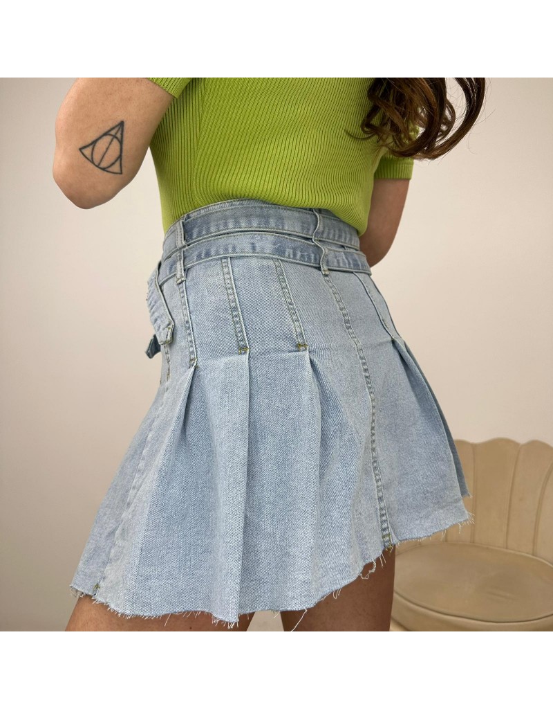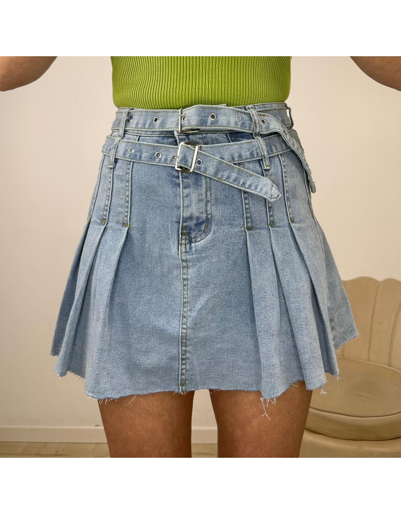Mini Gonna in jeans chiaro, a pieghe con doppia cintura.