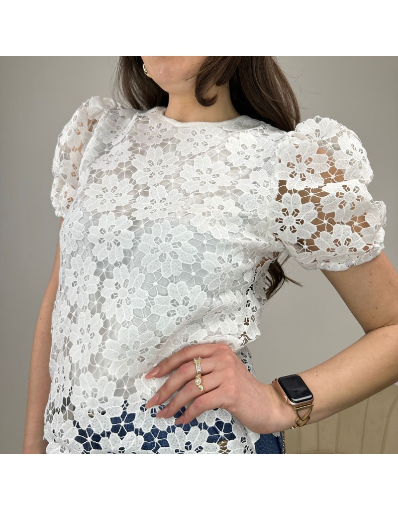 Maglia in pizzo, trama fiori, con mezza manica a sbuffo e collo rotondo.