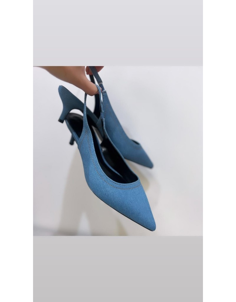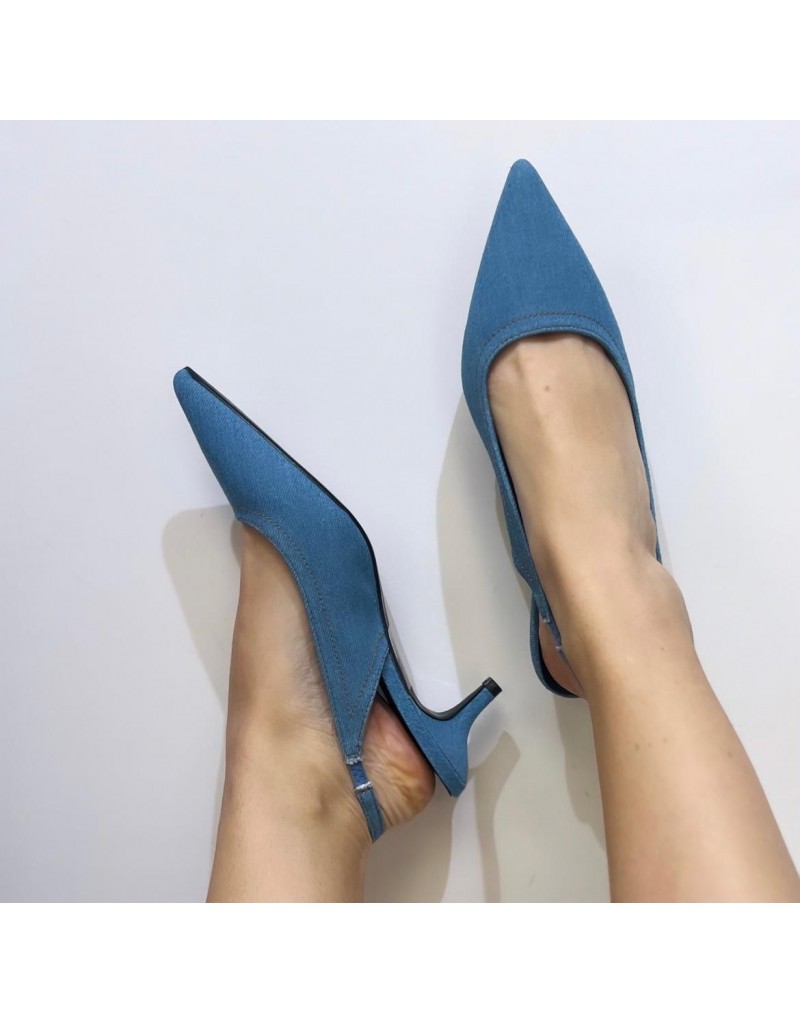 Decolleté dalla punta affusolata, in denim, con cinturino regolabile.
