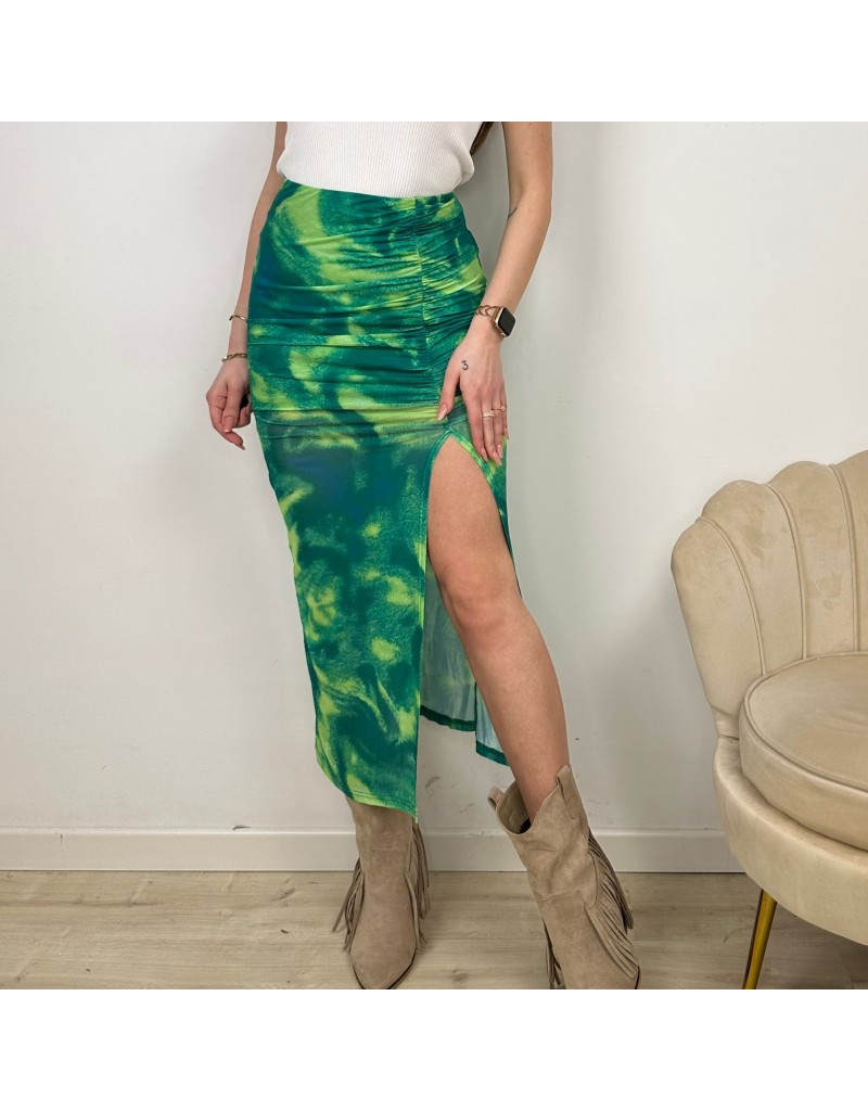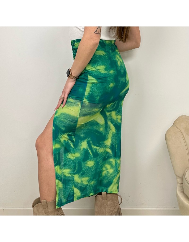 Gonna lunga , fantasia sfumata, con spacco e drappeggio laterale.