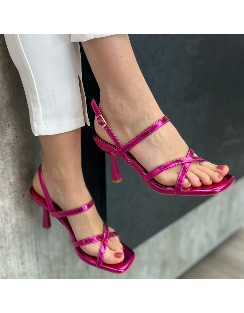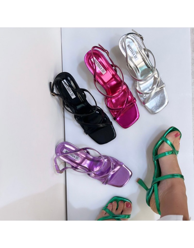 Sandalo in ecopelle metallizzata, con fascette sottili.