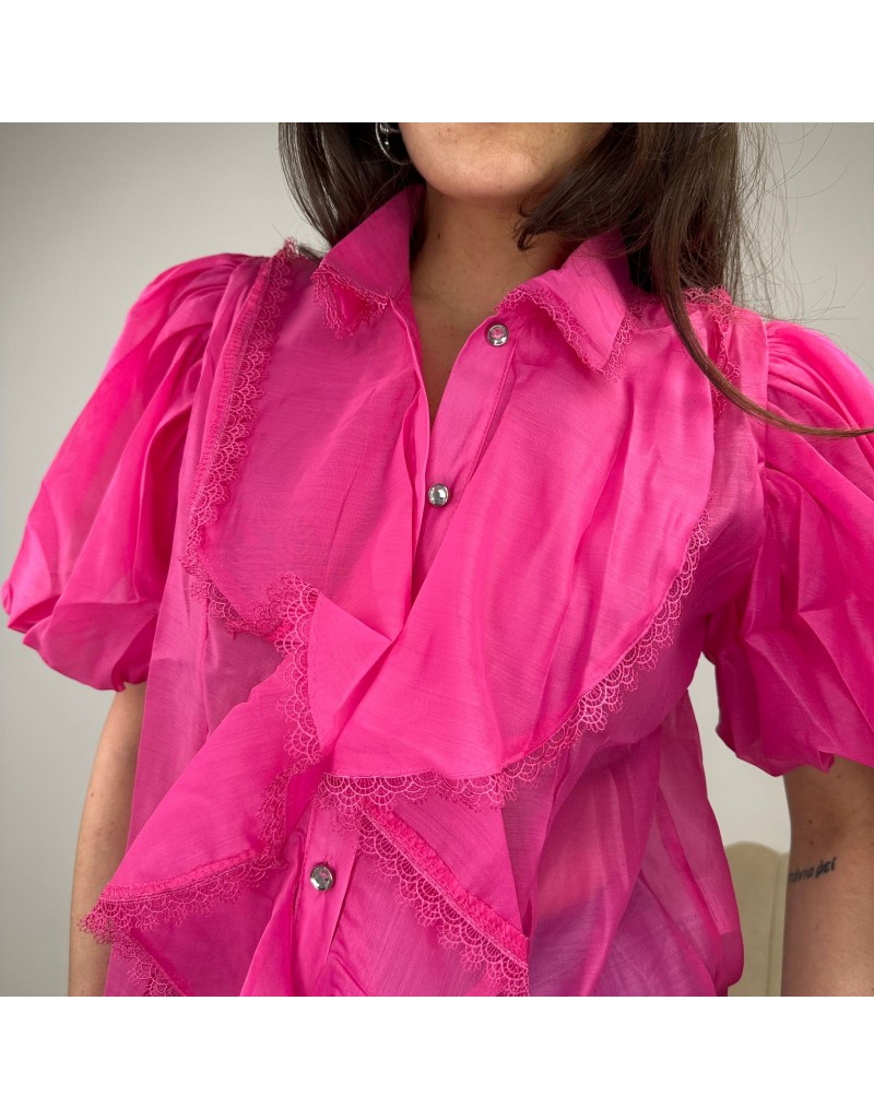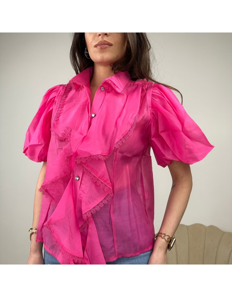 Camicia con maxi volant, pizzo sui bordi, e maniche a sbuffo.