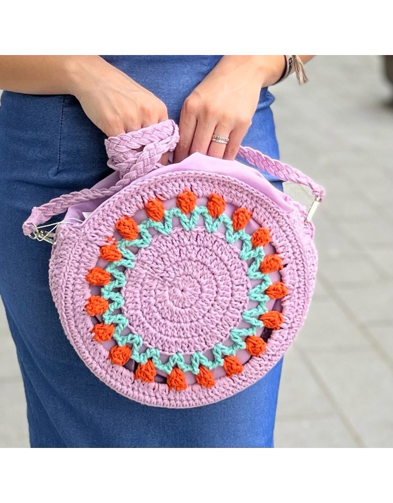 Borsa uncinetto, rotonda, con tracolla intrecciata.