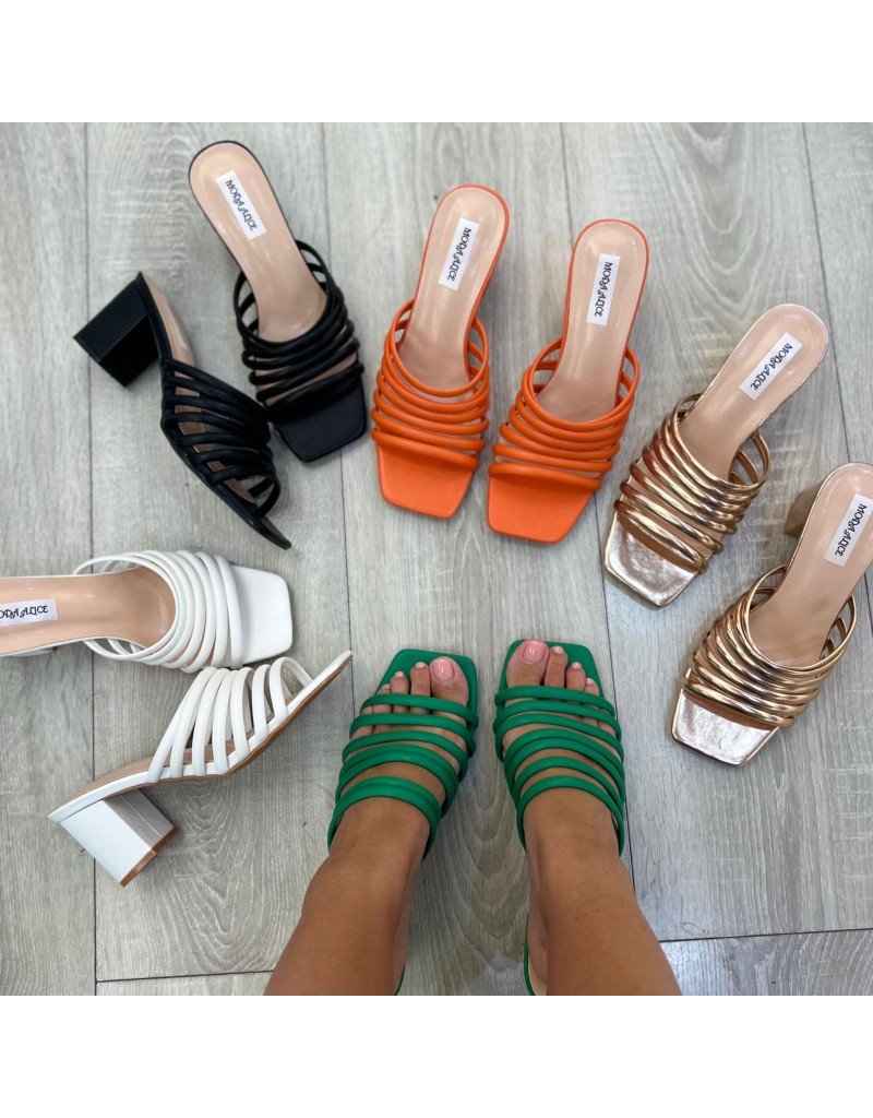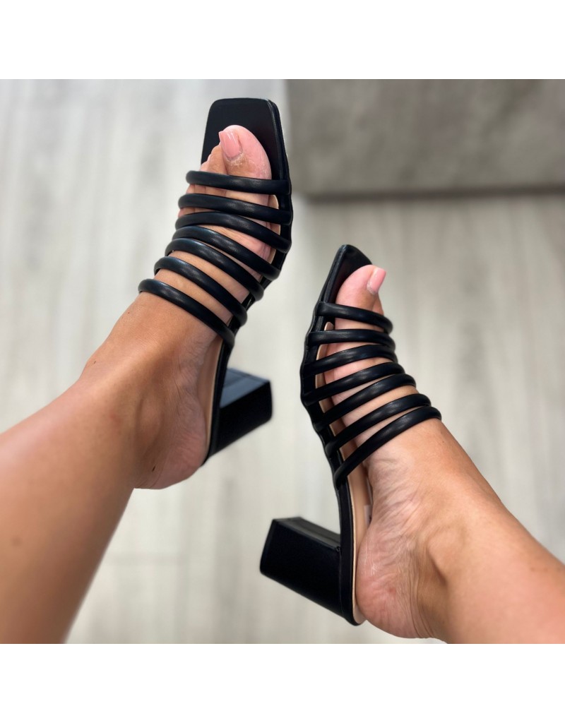 Sabot in ecopelle, con tomaia a fascette tubolari, punta squadrata e tacco largo da 8 cm.