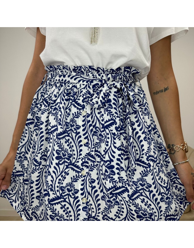 Gonna corta, fantasia foglie, con elastico in vita, cintura tono su tono e fila di bottoni centrali.