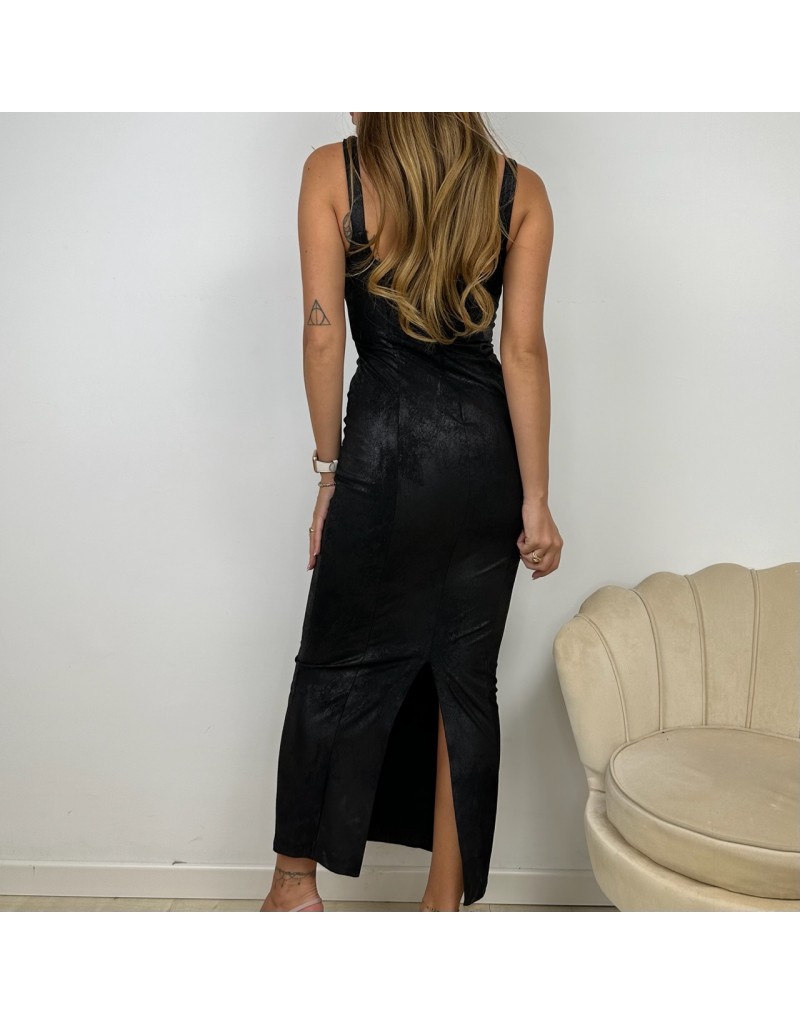 Abito lungo in similpelle elasticizzato con cerniera nascosta sul retro e spacco.