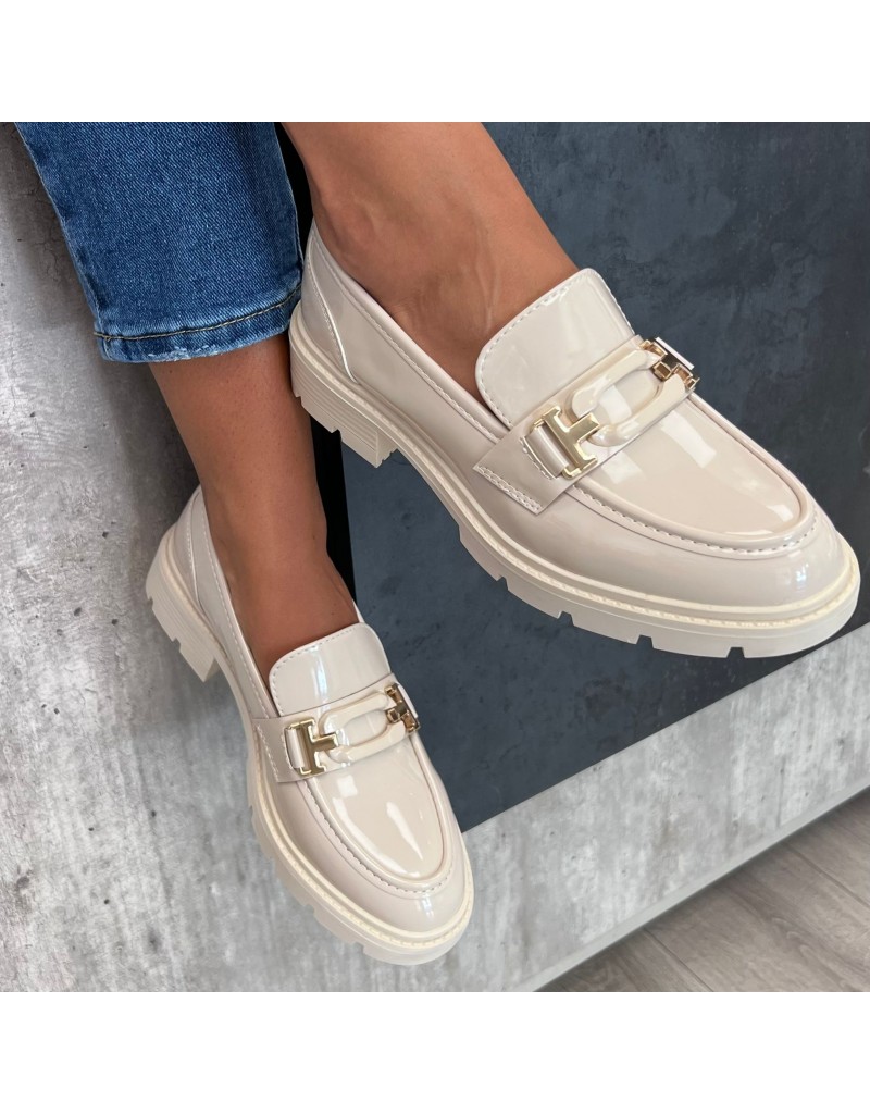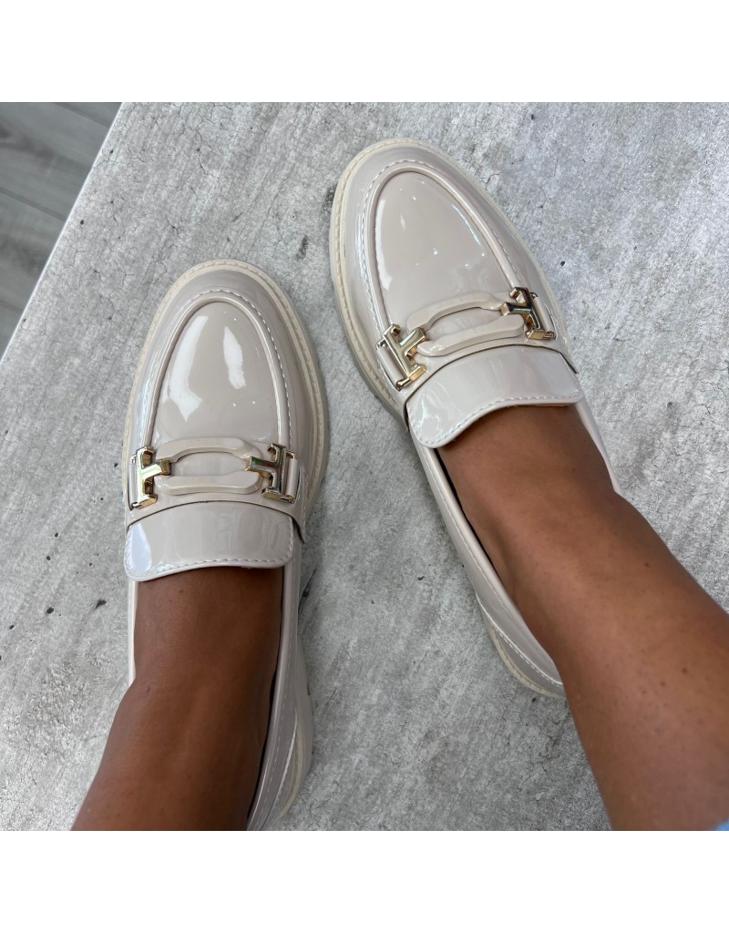 Mocassini in ecopelle lucida con fibbia sul collo.