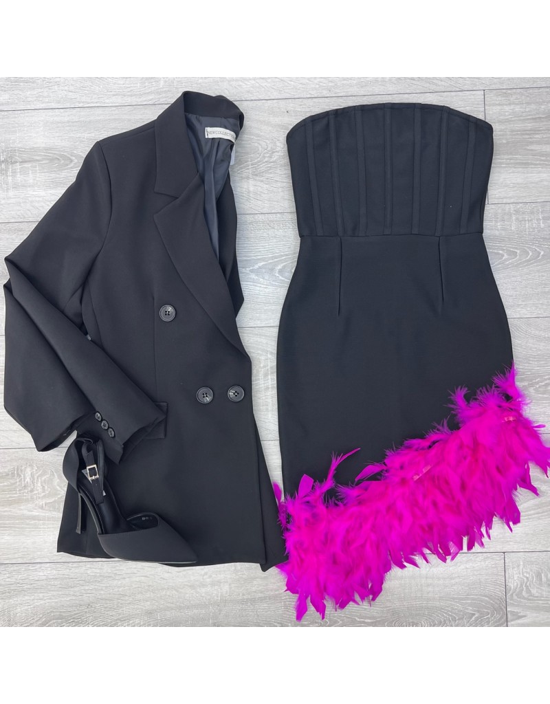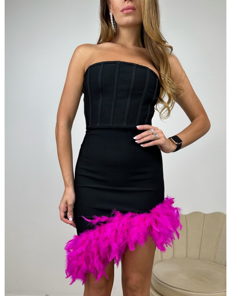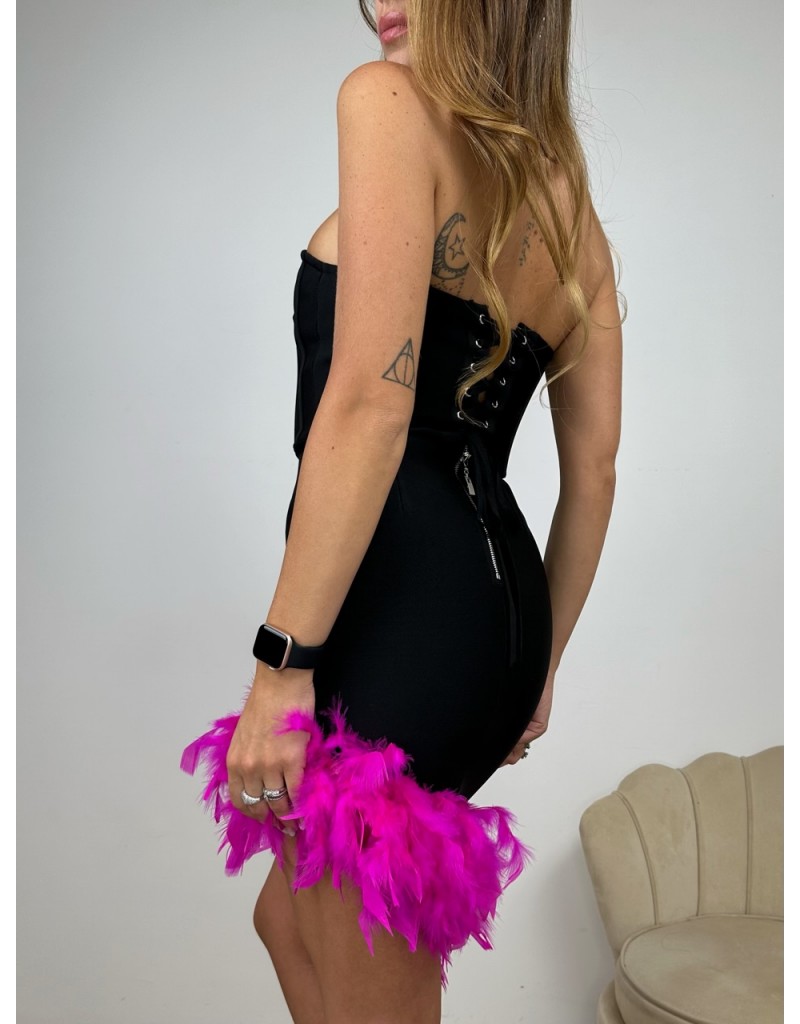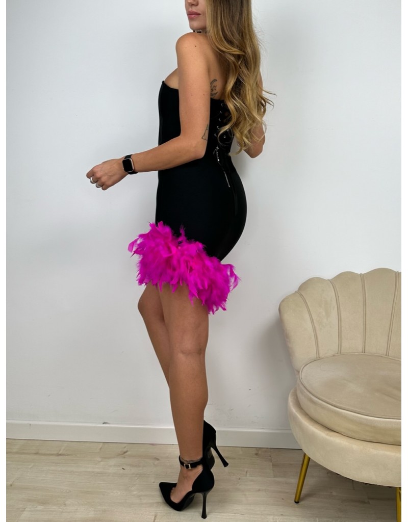 Vestito tubino bandage con piume fucsia nella parte bassa.