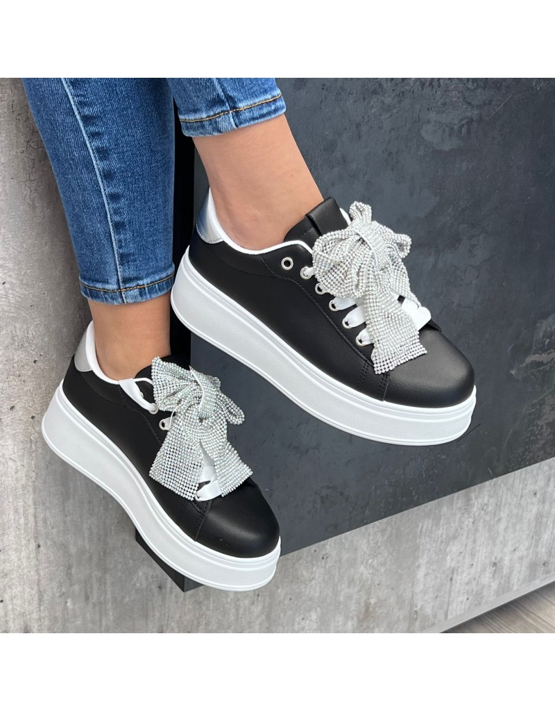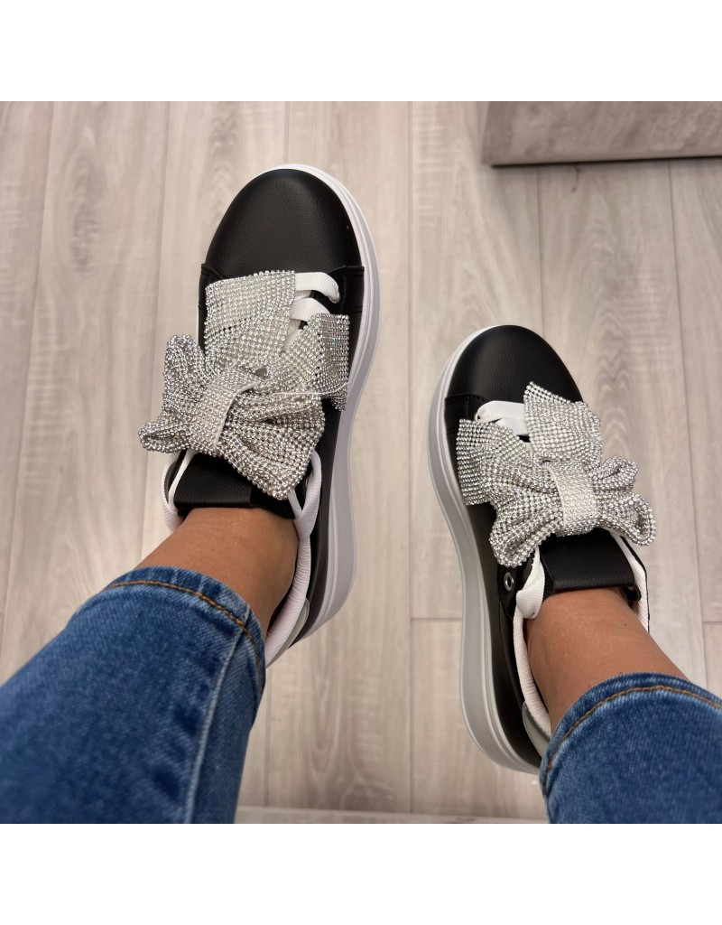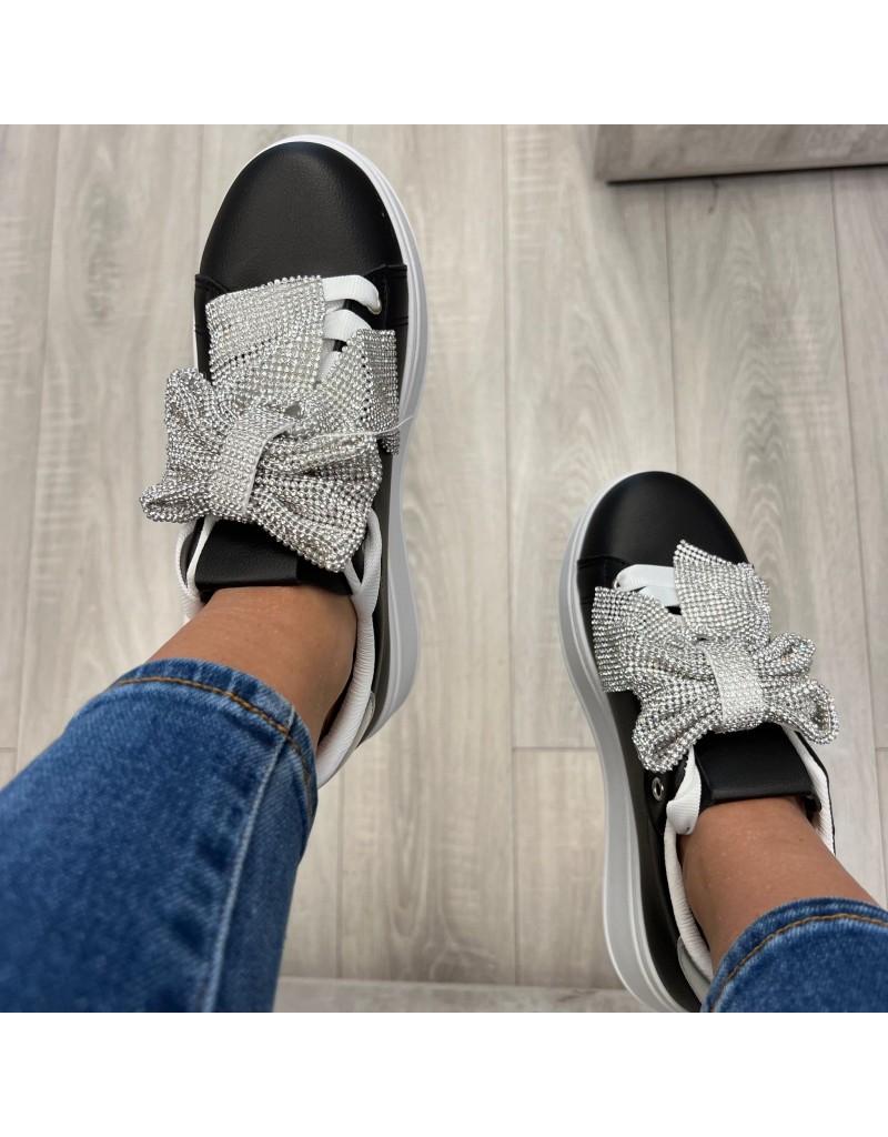 Sneakers in ecopelle con soletta rialzata,e particolare fiocco di strass applicato sul collo piede.