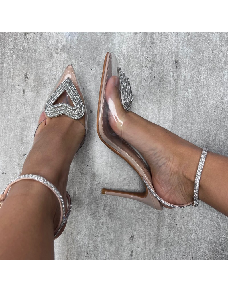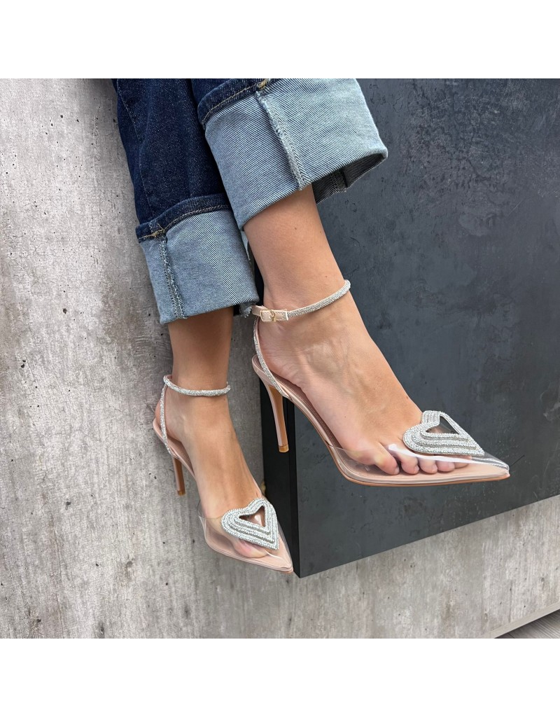 Dècolletè trasparente a punta,con strass applicati sulla parte anteriore.Tacco sottile alto,chiusura con cinturino