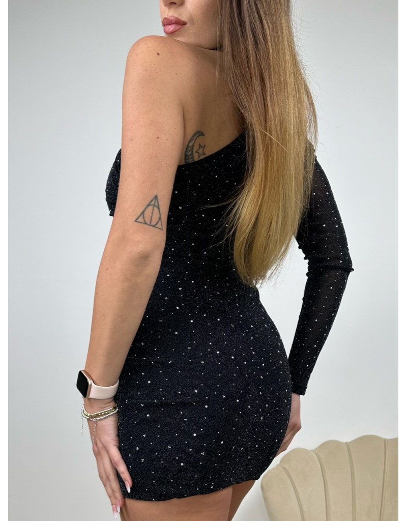 Dress corto velato aderente,a monospalla e dettaglio di brillantini applicati.