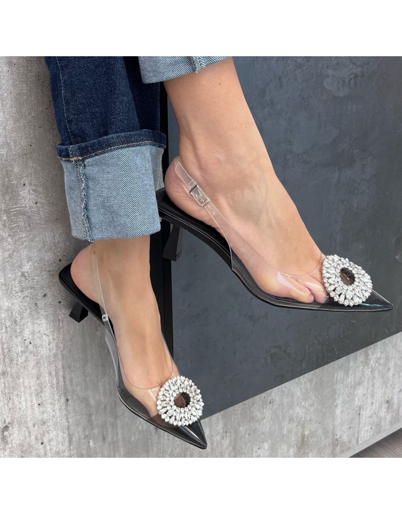 Scarpa modello dècolletè trasparente, con applicazione gioiello sulla punta.