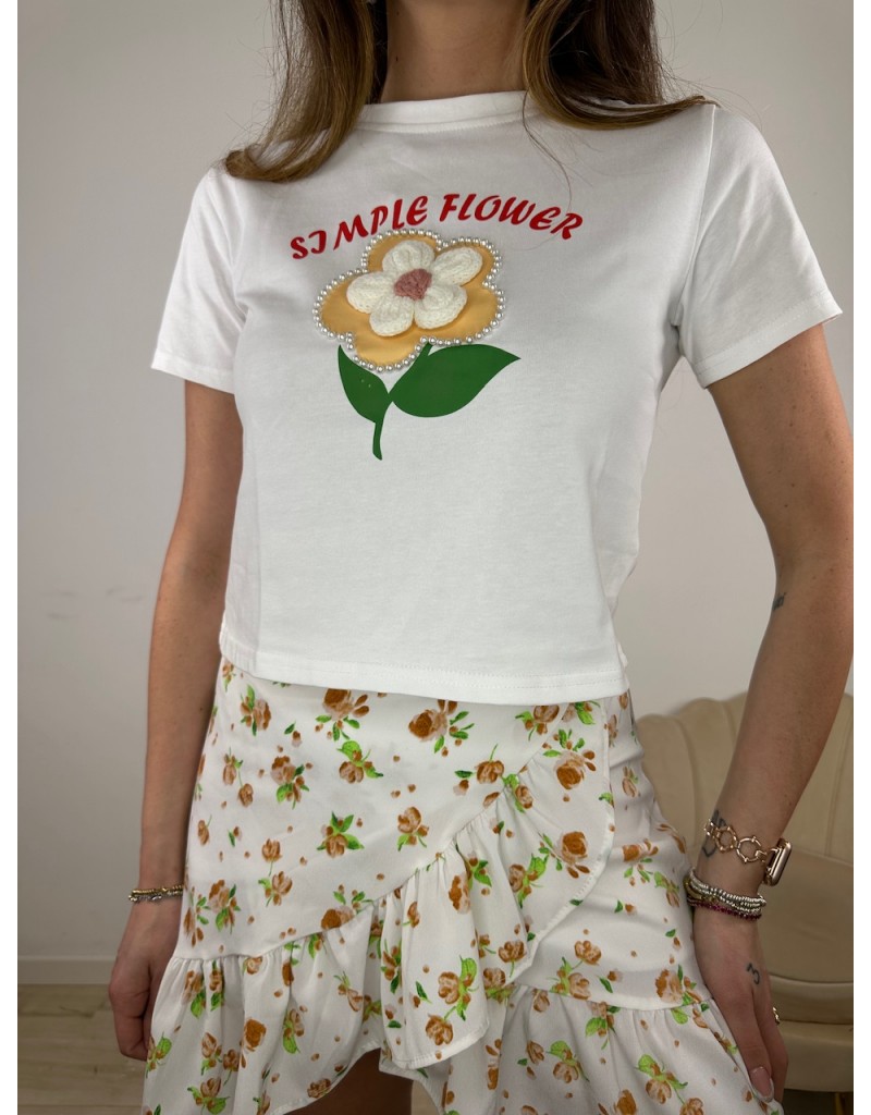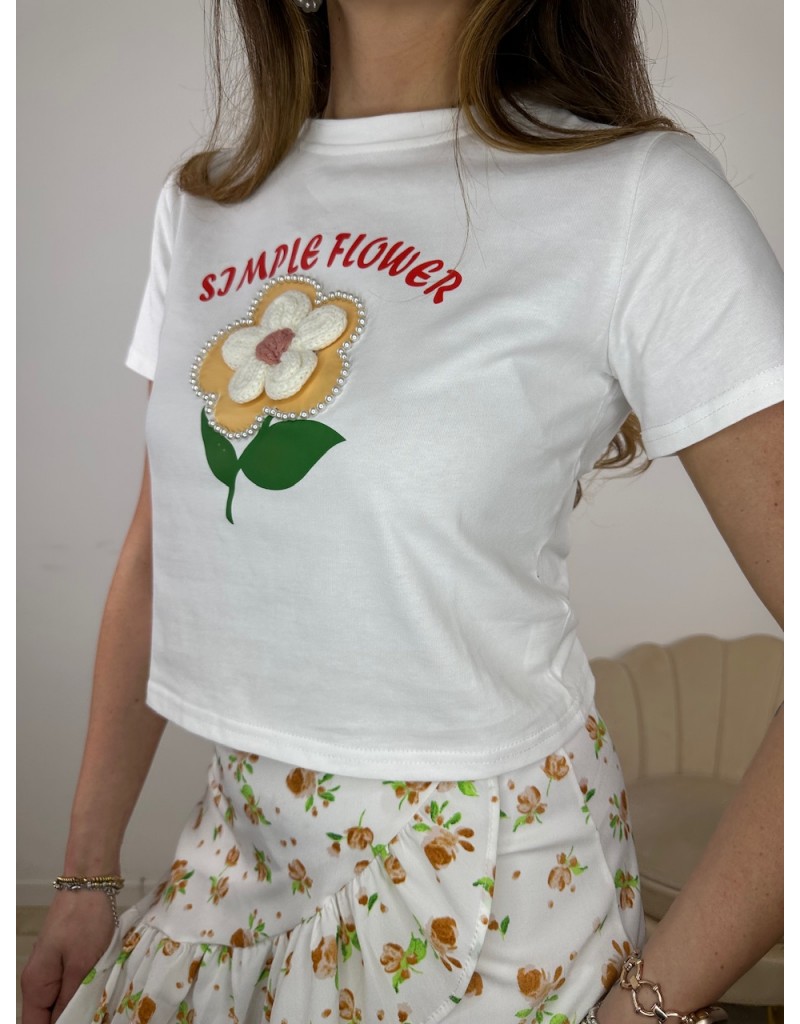 T-Shirt mezza manica con fiore ricamato centrale e scritta.