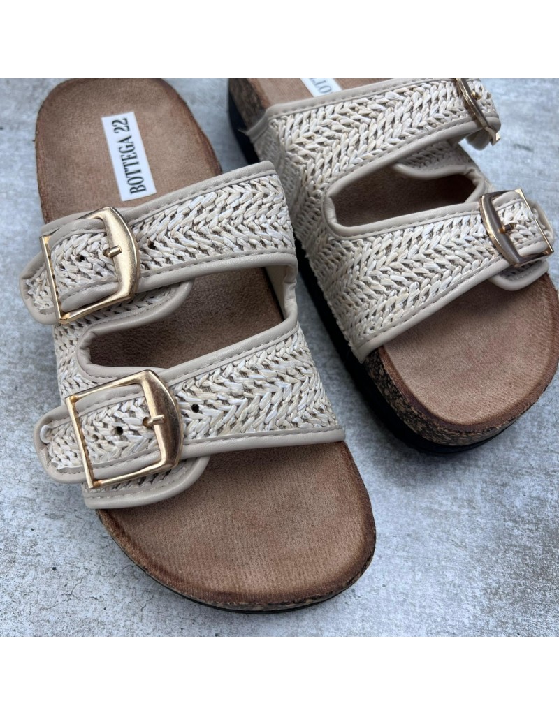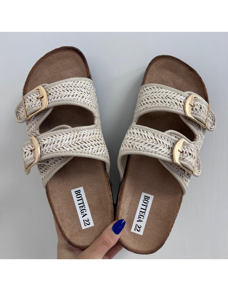 Ciabatte con fibbiette in tessuto ecopelle intrecciato.