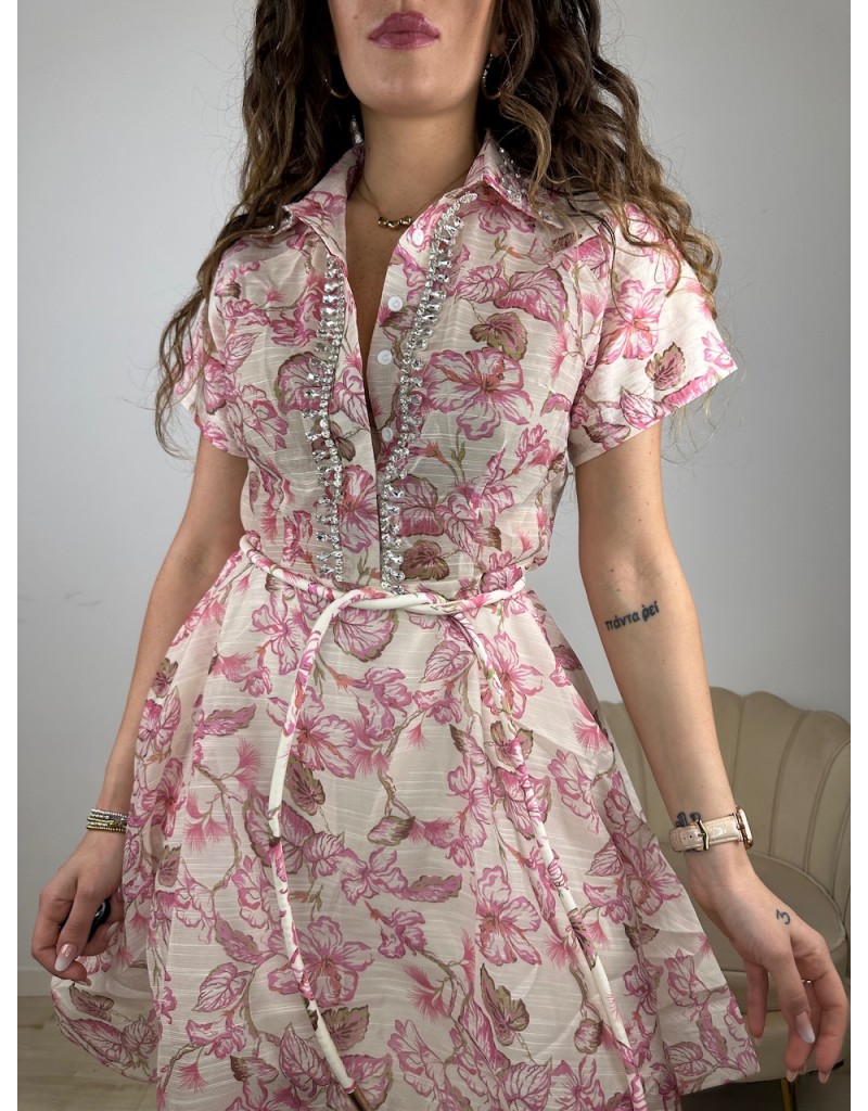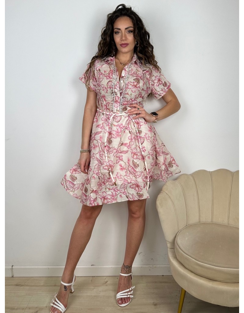 Vestito a fantasia in tessuto TopQuality con bordo camicia in applicazioni gioiello.