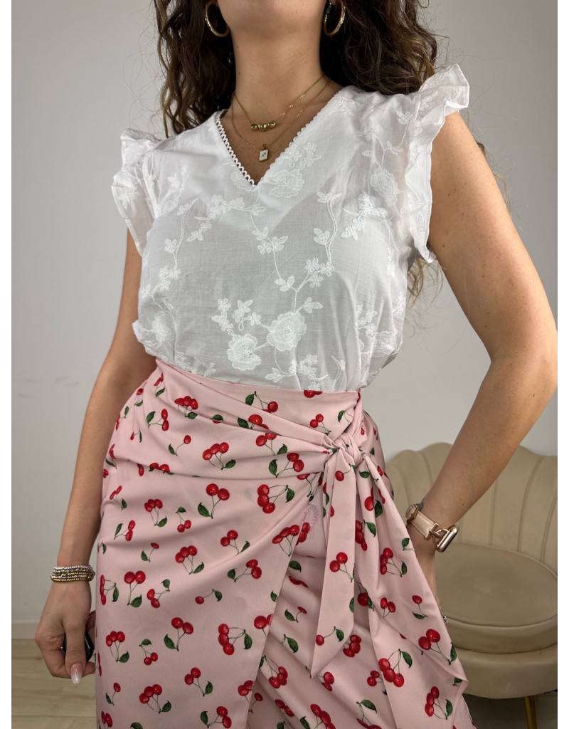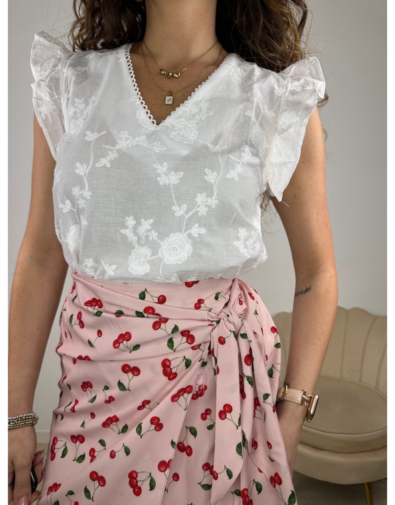 Blusa in pizzo Sangallo con manica a giro voilant.