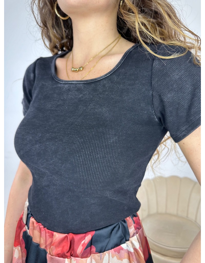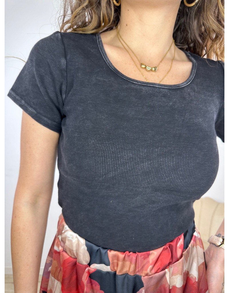 T-Shirt modello crop a costine con effetto vintage.