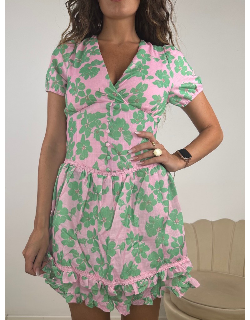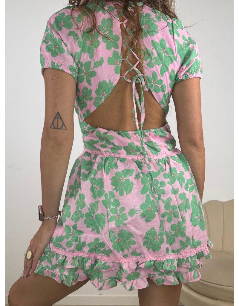 Vestito in simillino a fantasia con intreccio posteriore.