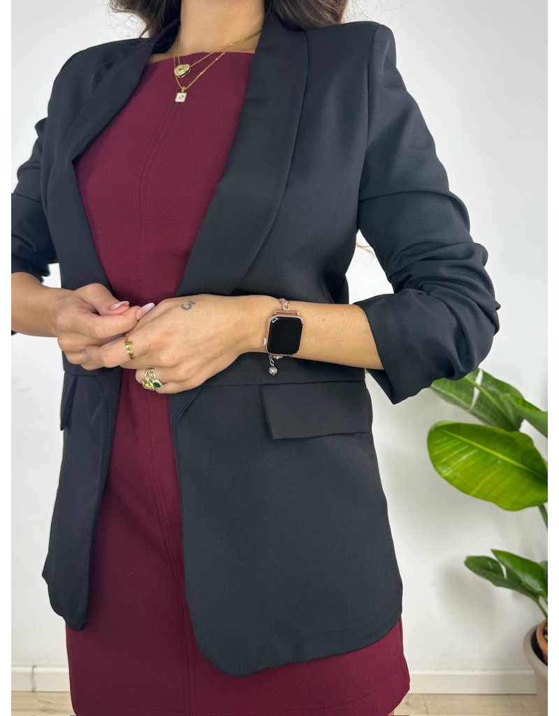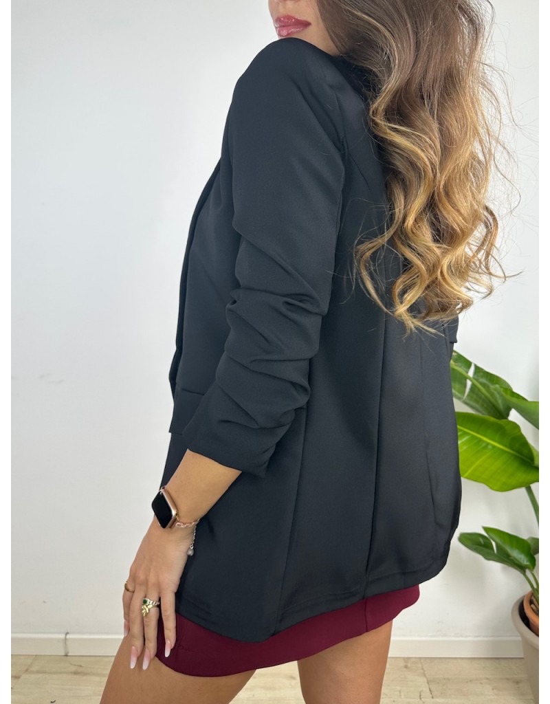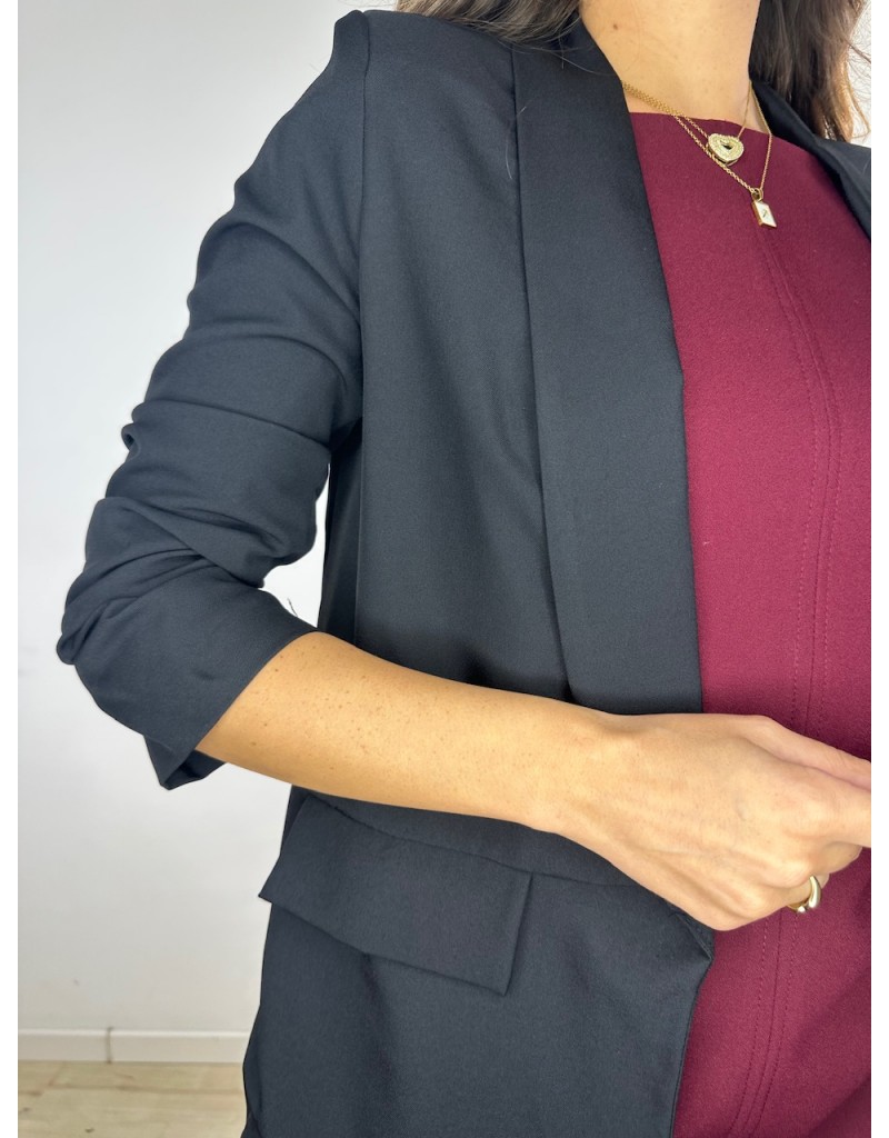 Giacca in tessuto con collo a scialle, modello senza bottoni. patte laterali, maniche a tre quarti con cuciture arricciate