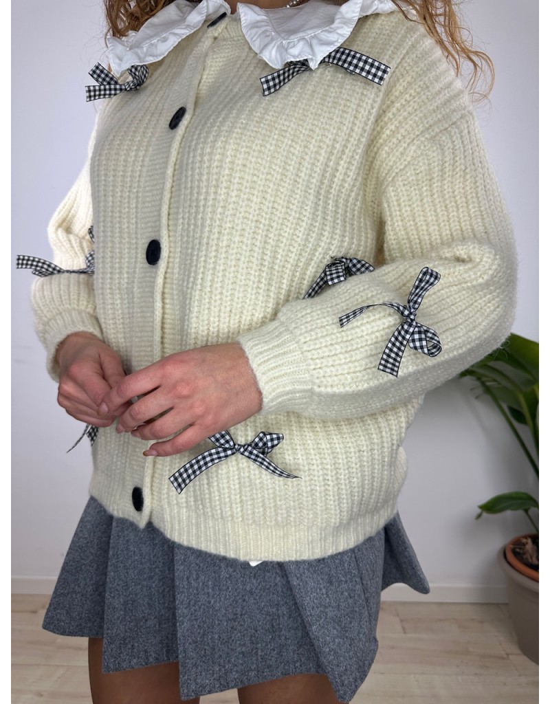 Cardigan Maxi con fiocchetti a quadrettini. Modello Girocollo.